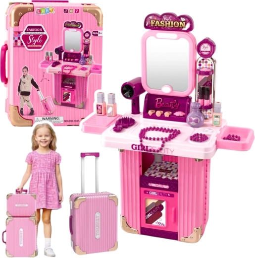 Štýlová detská toaletka 2v1 v praktickom kufríku, ktorá sa po rozložení premení na čarovný kozmetický stolík. Ponúka osvetlené zrkadielko, zvukové efekty a bohaté príslušenstvo na hru na salón krásy. Ľahká, mobilná vďaka kolieskam a výsuvnej rukoväti, vyrobená z bezpečných materiálov – podporuje kreativitu, predstavivosť a jemnú motoriku.