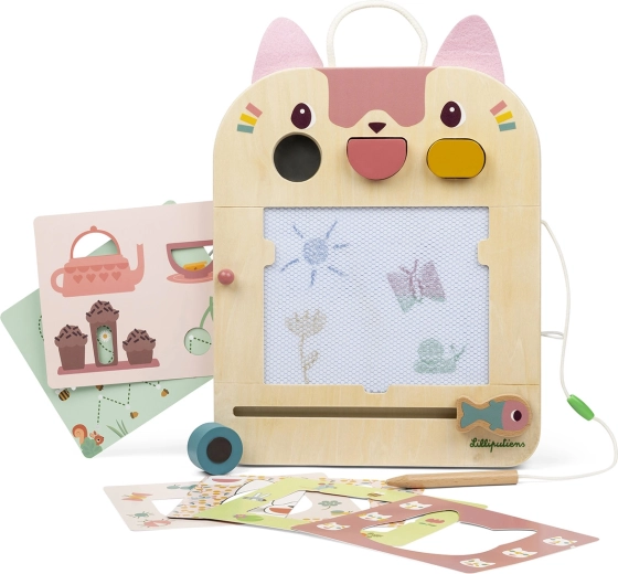 Objavte kúzelnú kresliacu tabuľku mačička Jeanne od Lilliputiens, ktorá deťom od 18 mesiacov ponúka nekonečné možnosti kreslenia a hier. Súčasťou sú 3 pečiatky s tvarmi, 6 obojstranných kariet s aktivitami a drevená ceruzka na šnúrke. Obrázky možno ľahko rýchlo vymazať a začať znova – ideálne na rozvoj jemnej motoriky a zmyslového vnímania.