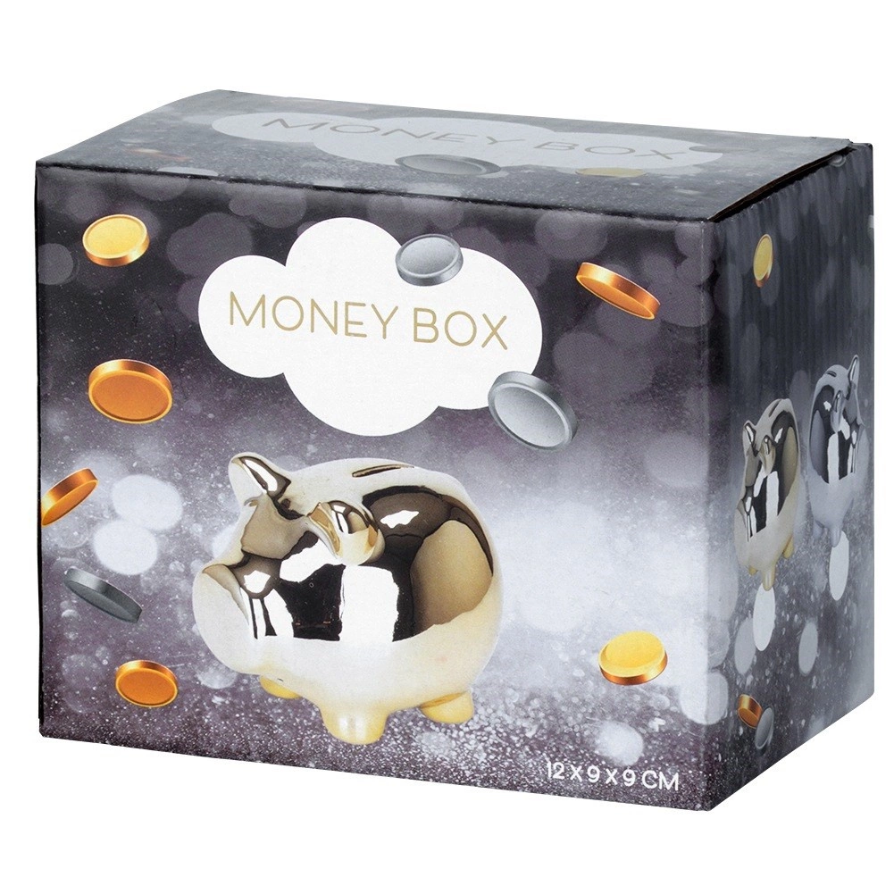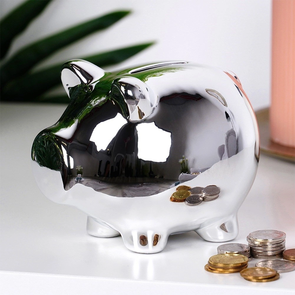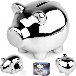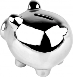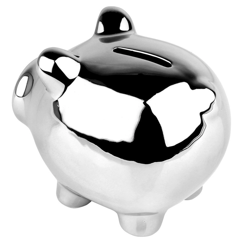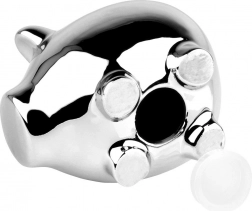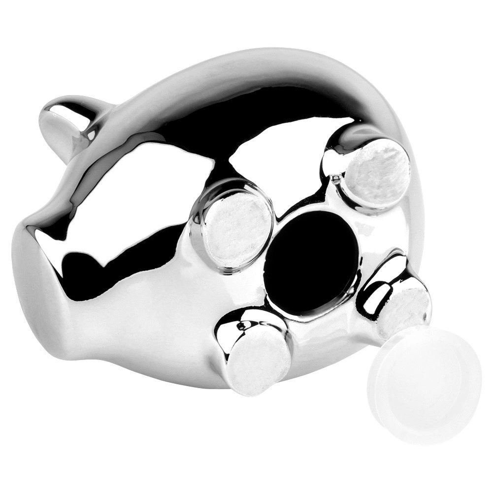 Štýlová strieborná pokladnička v tvare prasiatka je ideálna na ukladanie mincí aj bankoviek. Lesklé zrkadlové prevedenie dodá každému interiéru moderný nádych a ľahko zapadne do elegantného glamour štýlu. Spodný otvor s uzáverom umožňuje pohodlné vybratie úspor bez nutnosti pokladničku rozbíjať.