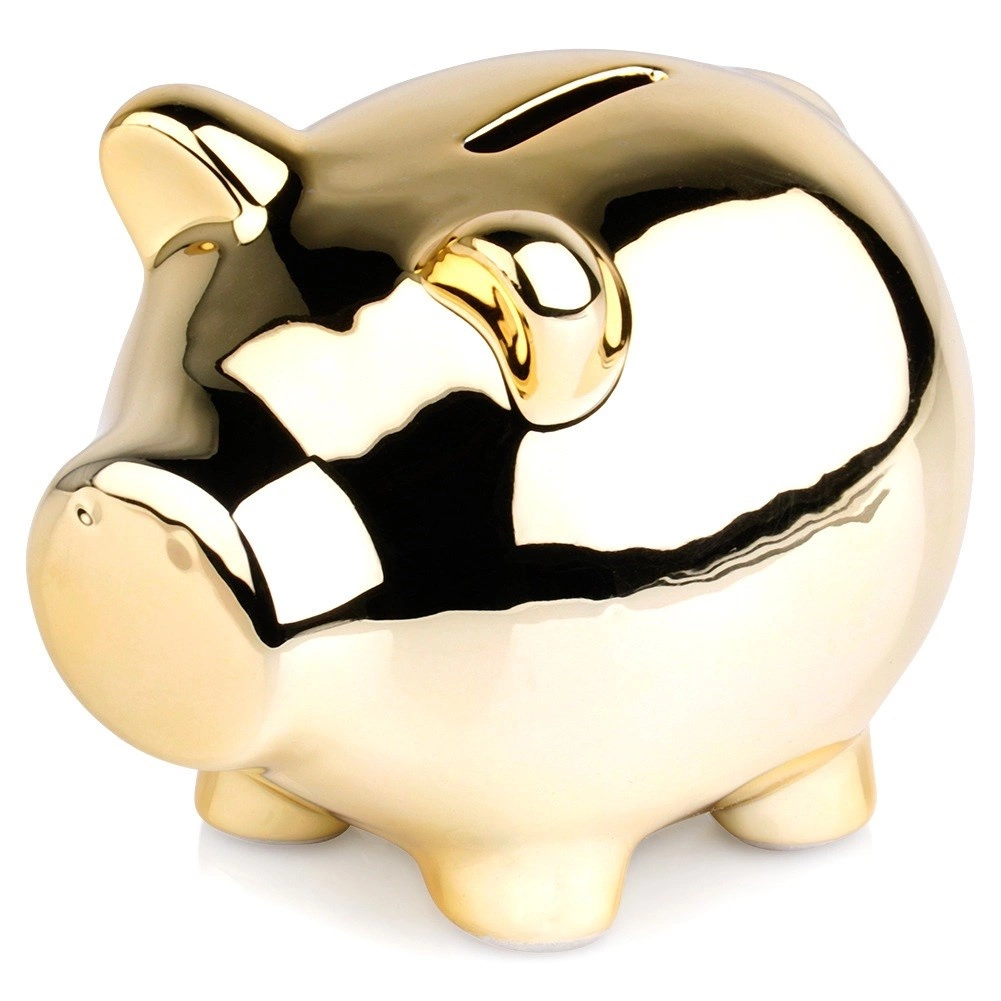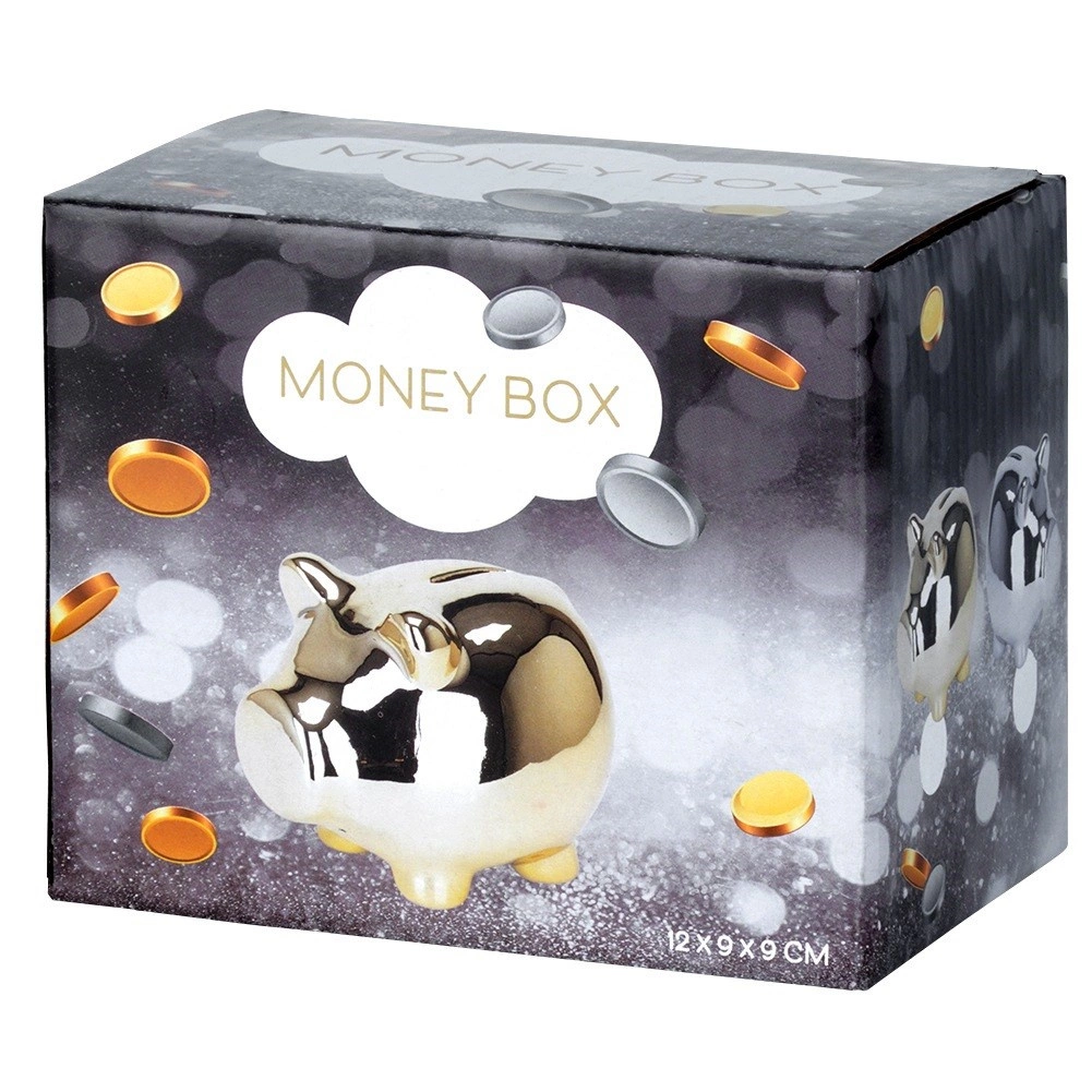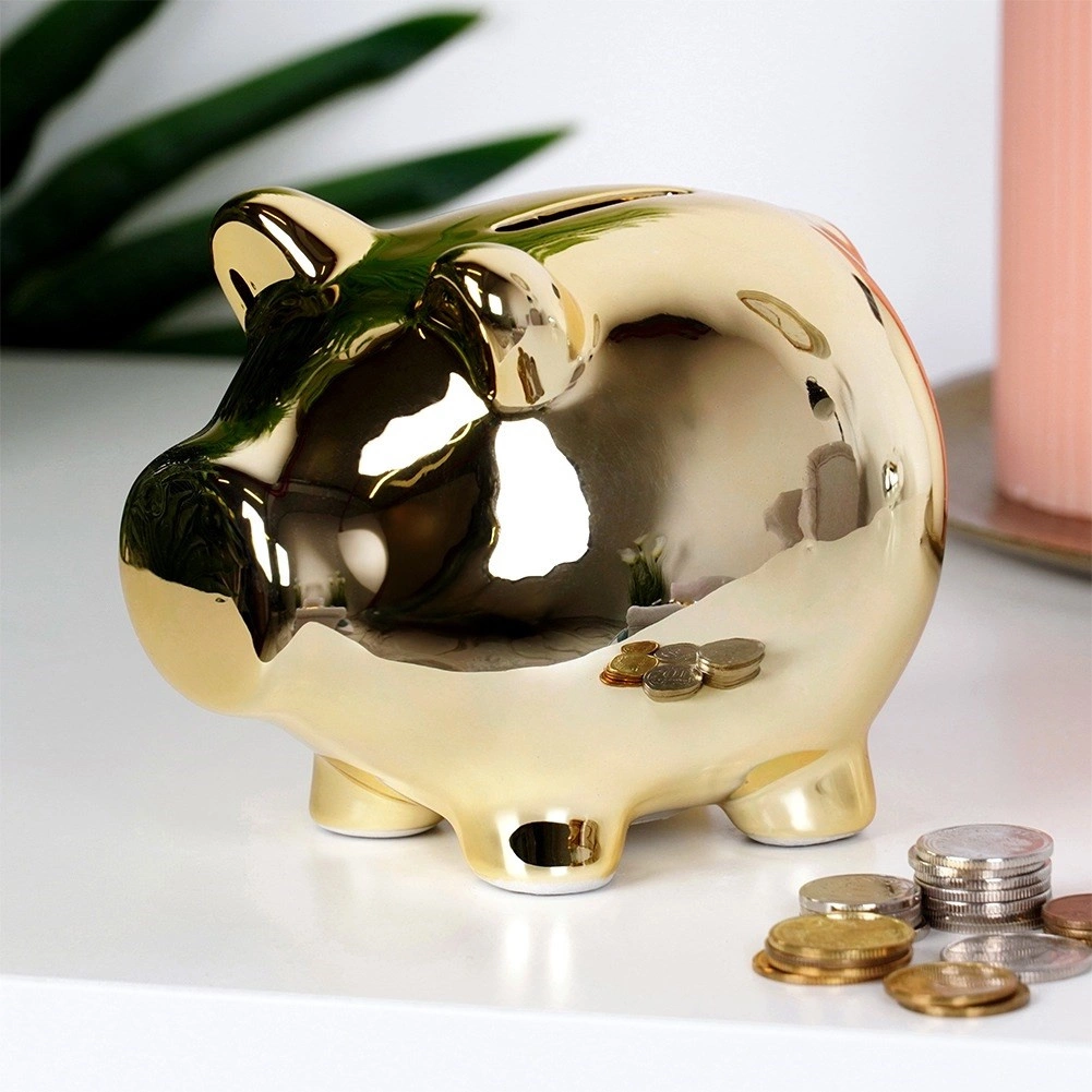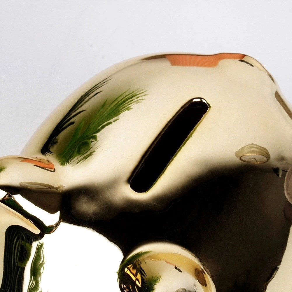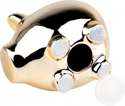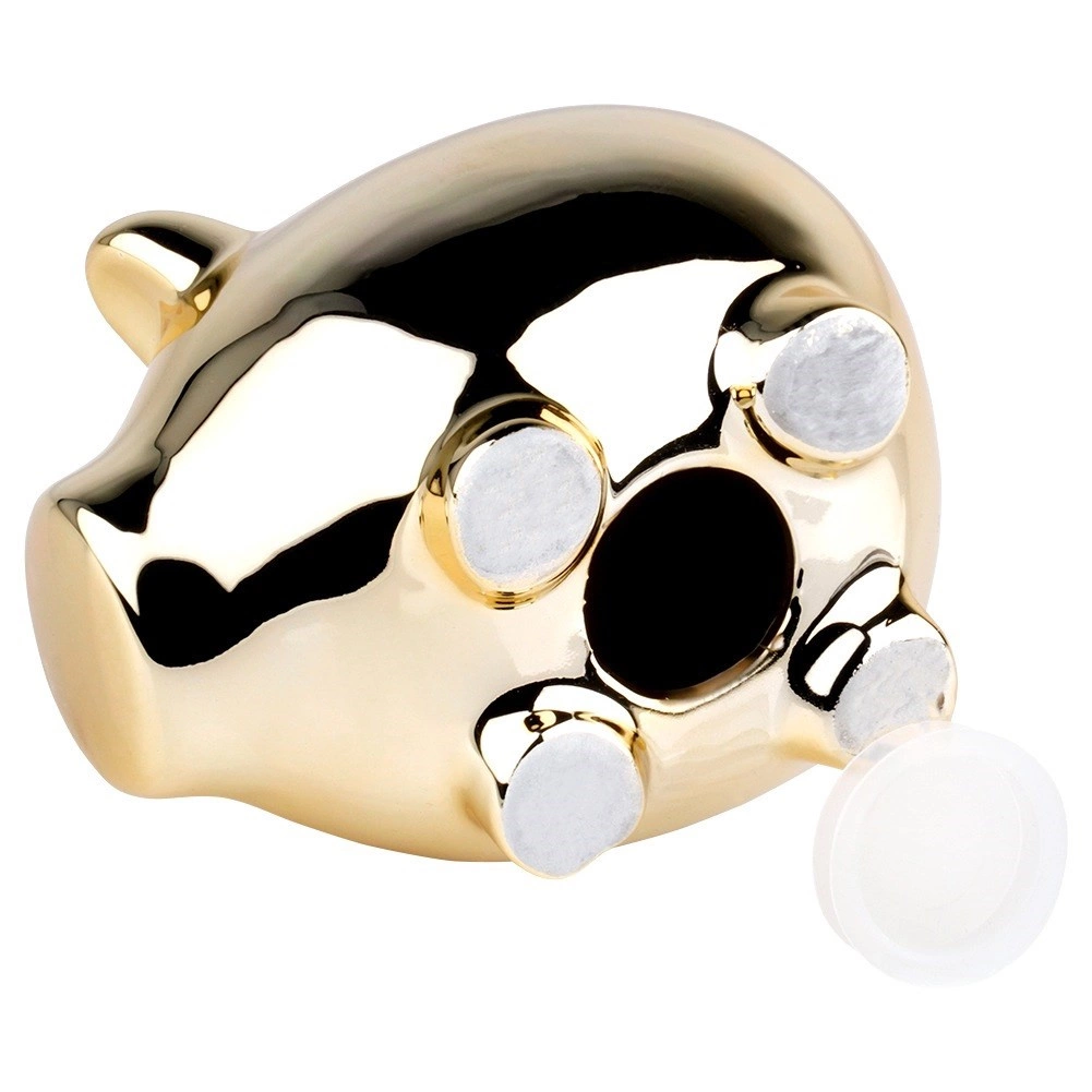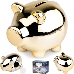 Elegantná keramická pokladnička v podobe klasického prasiatka kombinuje funkčnosť a dizajn. Zrkadlová zlatá povrchová úprava rozžiari policu, stôl aj detskú izbu a motivuje k každodennému ukladaniu drobných úspor.