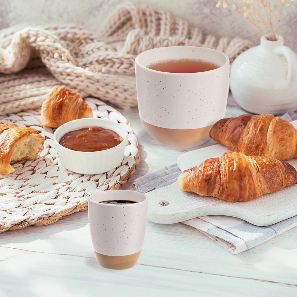 Užite si svoje obľúbené espresso v štýle. Táto malá šálka s objemom 90 ml má nadčasový minimalistický vzhľad: horná časť s jemnou bodkovanou glazúrou v bielej farbe plynulo prechádza do prírodnej, neglazovanej kameniny. Hrubšie steny lepšie udržujú teplotu nápoja a pohodlný tvar sa skvele drží.