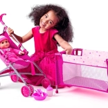 Táto krásna súprava obsahuje všetko, čo vaše dieťa potrebuje k starostlivosti o svoju obľúbenú bábiku. Súčasťou je športový kočík s kovovou konštrukciou, ktorý je veľmi praktický vďaka ľahkej manipulácii. Ďalej je priložená cestovná postieľka, ideálna na domáce aj vonkajšie hranie.