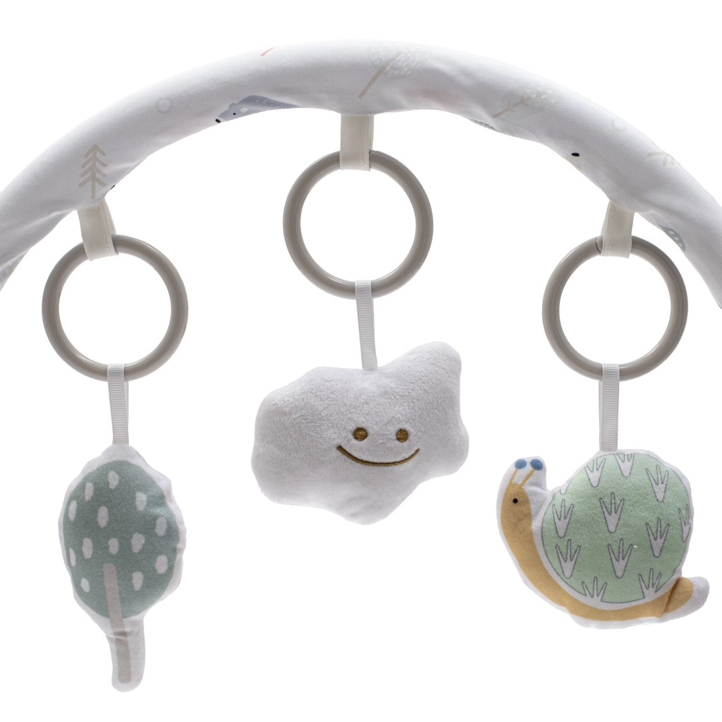 Odnímateľná hrazdička s tromi mäkkými hračkami podporuje koordináciu a rozvoj zmyslov. Možno ju ľahko zložiť na kŕmenie alebo spánok.
