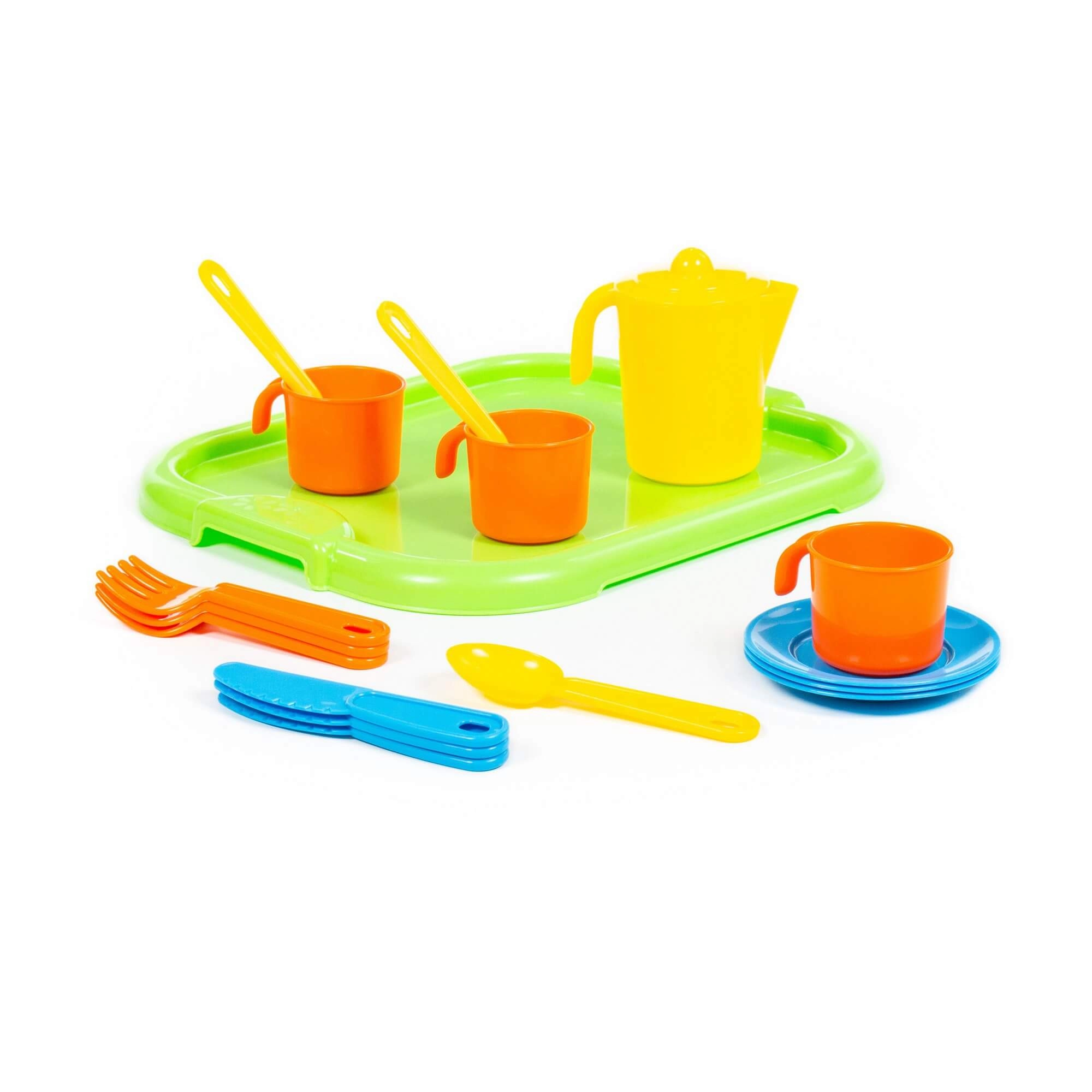 Táto hravá čajová sada ponúkne deťom množstvo zábavy pri servírovaní a rolových hrách. Súčasťou je tácka na ľahké prenášanie, kanvička a riad pre troch „hostí“. Vďaka ľahkému a odolnému plastu je sada vhodná na každodenné používanie doma aj v škôlke.
