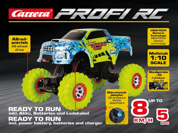Zažite adrenalín v teréne s modelom CARRERA PROFI RC Crawler 4x4 v mierke 1:10. Ponúka pohon všetkých kolies, digitálne proporcionálne ovládanie, olejové tlmiče pre hladkú jazdu a vodoodolné prevedenie. Rýchlosť až 8 km/h, veľké neónovo zelené pneumatiky s hlbokým dezénom a prevedenie Ready To Run sú zárukou zábavy pre náročných jazdcov od 14 rokov.