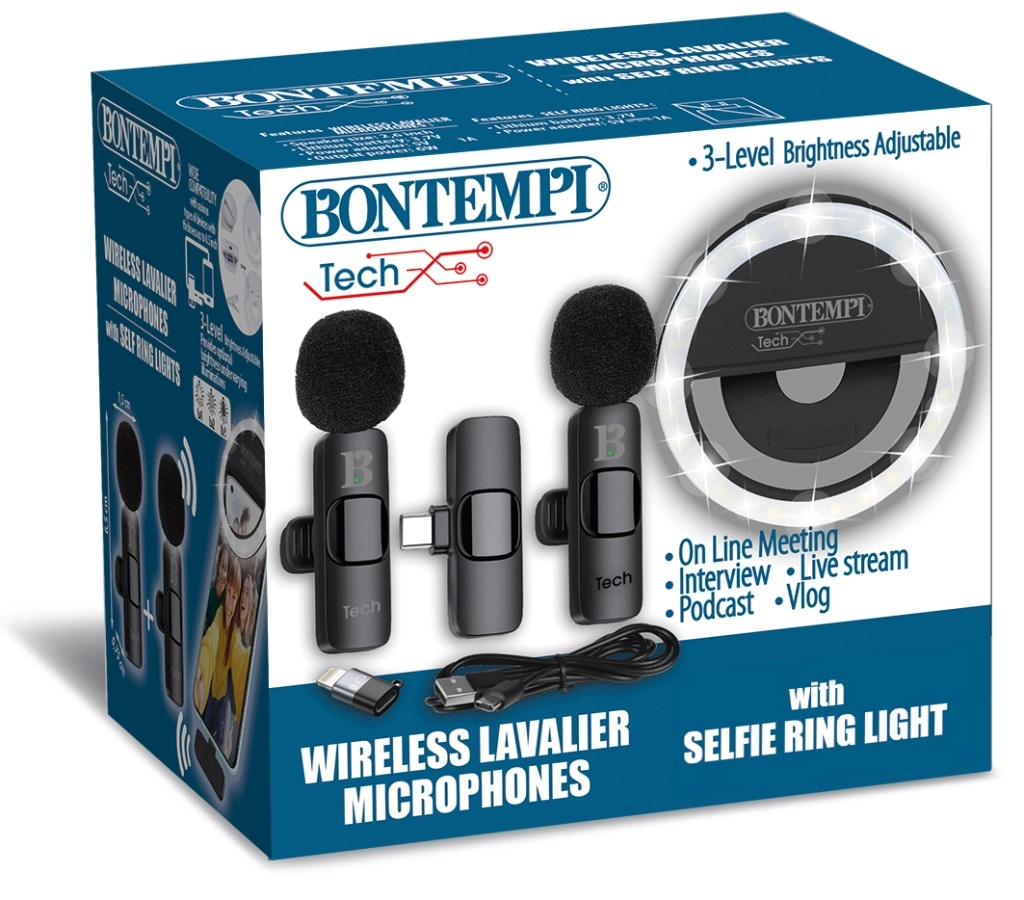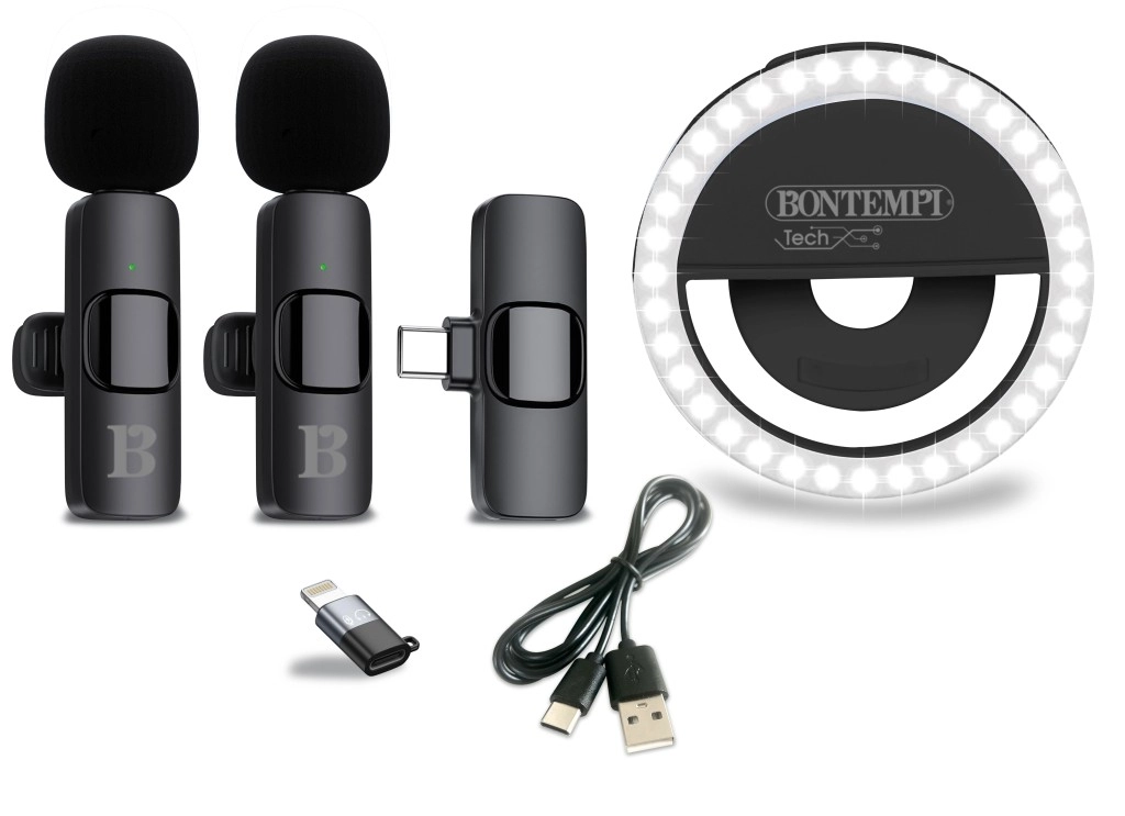 Táto praktická sada spája kvalitné osvetlenie a bezdrôtový záznam zvuku v jednom. Mini kruhové LED svetlo sa ľahko pripevní a vďaka 3 stupňom jasu zaistí prirodzené nasvietenie pri nakrúcaní prednou kamerou. Dva klopové mikrofóny sa pripnú na odev a spoľahlivo prenesú hlas bez okolitého ruchu, čo ocenia vlogeri, tvorcovia Reels/Shorts aj podcasteri.