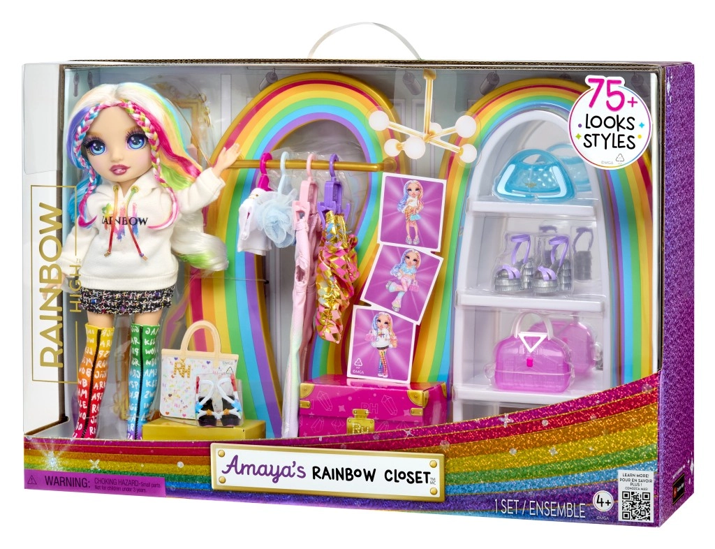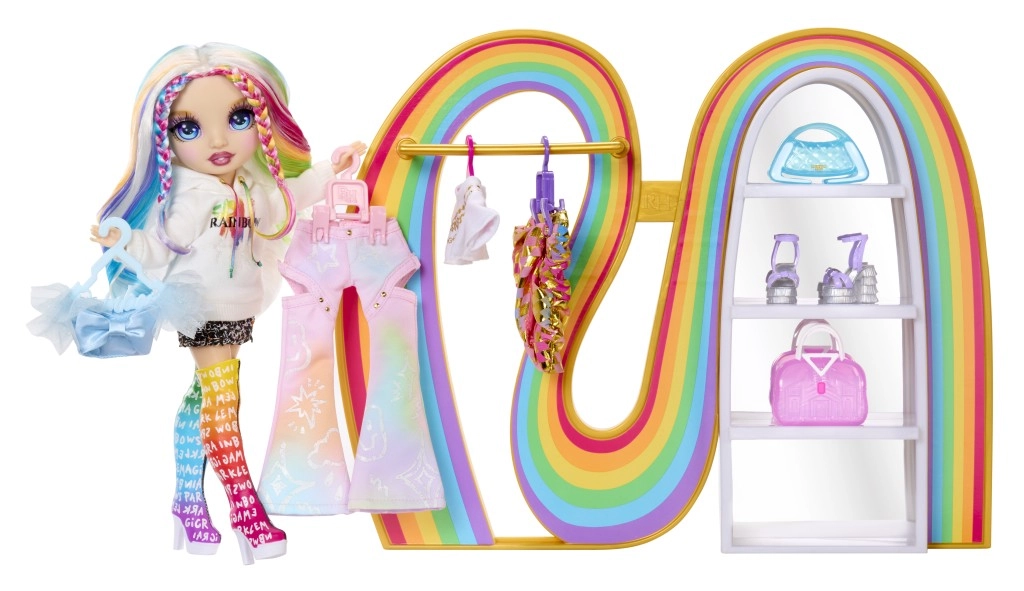 - 1 bábika, dúhový šatník/stojan, 6 módnych kúskov, 2 páry topánok, 2 kabelky, hrebeň, šatníkový stojan so 4 vešiakmi, 4 poschodové regály na topánky