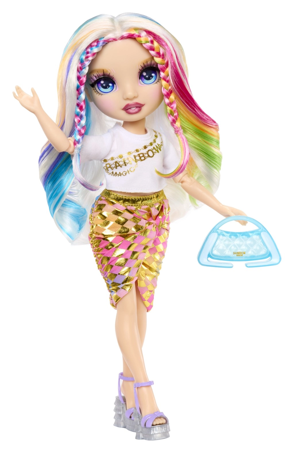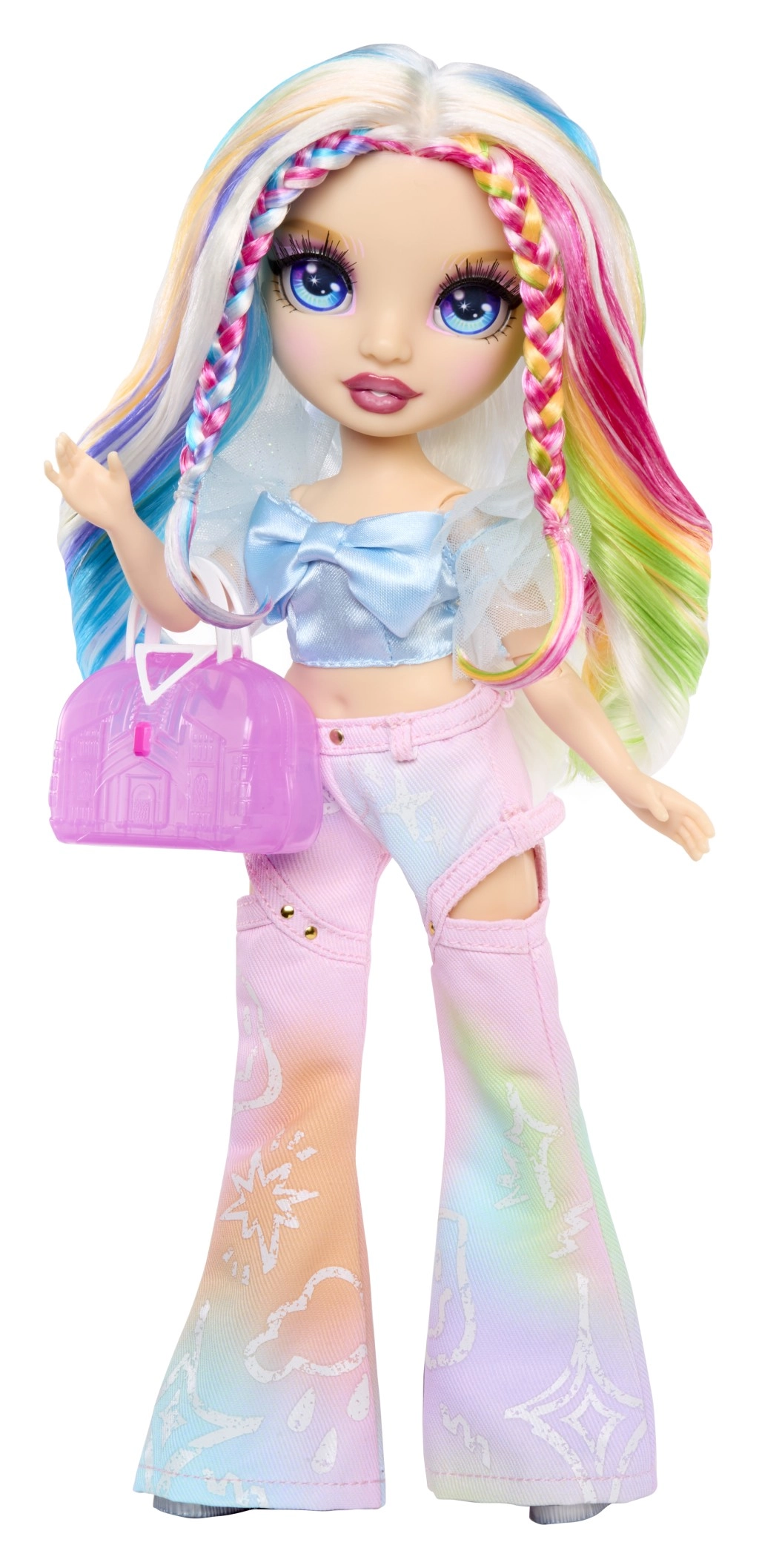 Bábika s dlhými dúhovými vlasmi a detailnými doplnkami je skvelá na pózovanie, fotenie aj hranie módnej prehliadky.