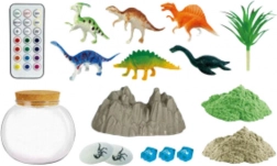 - Plastové akvárium s korkom, dekoratívny piesok (2 farby), rastlinné prvky a kamienky, figúrky dinosaurov, LED podsvietenie s ovládačom, návod