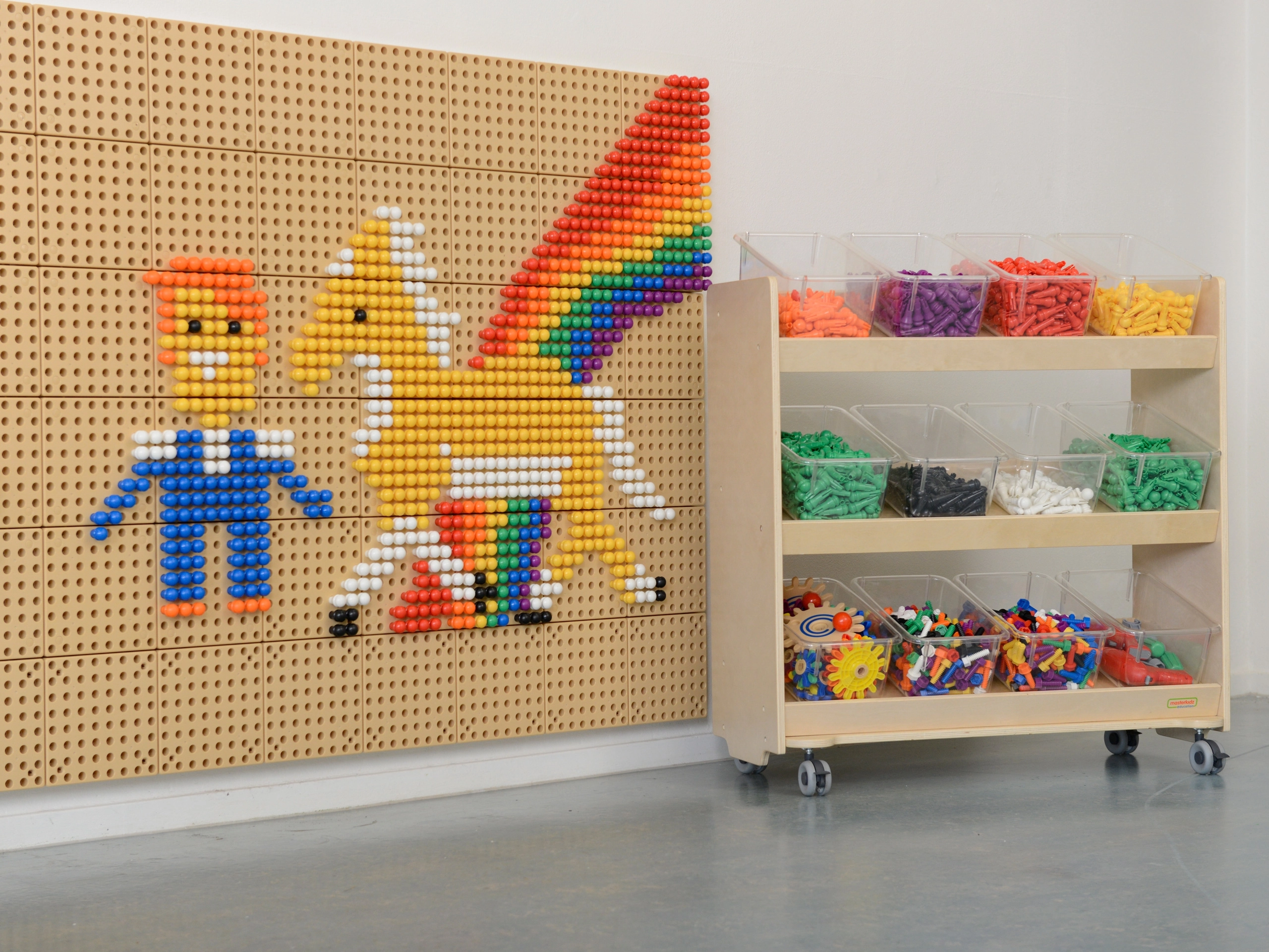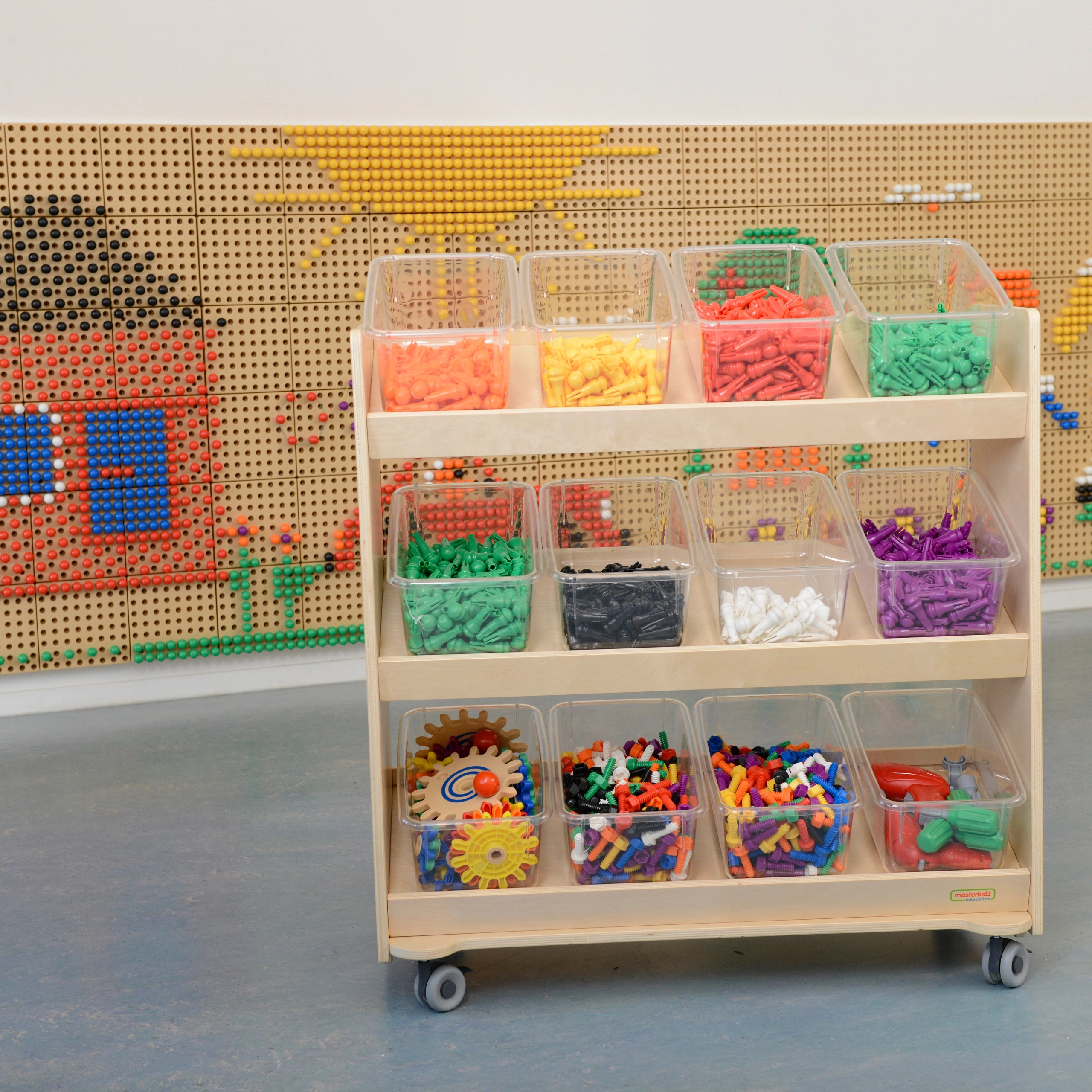 Otvorené a naklonené police udržia obsah viditeľný a dostupný – deti si samy vyberú správne diely bez zbytočného hľadania.
