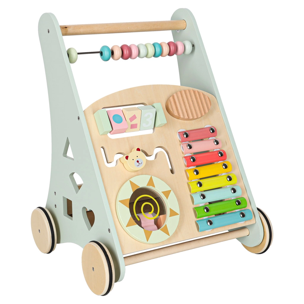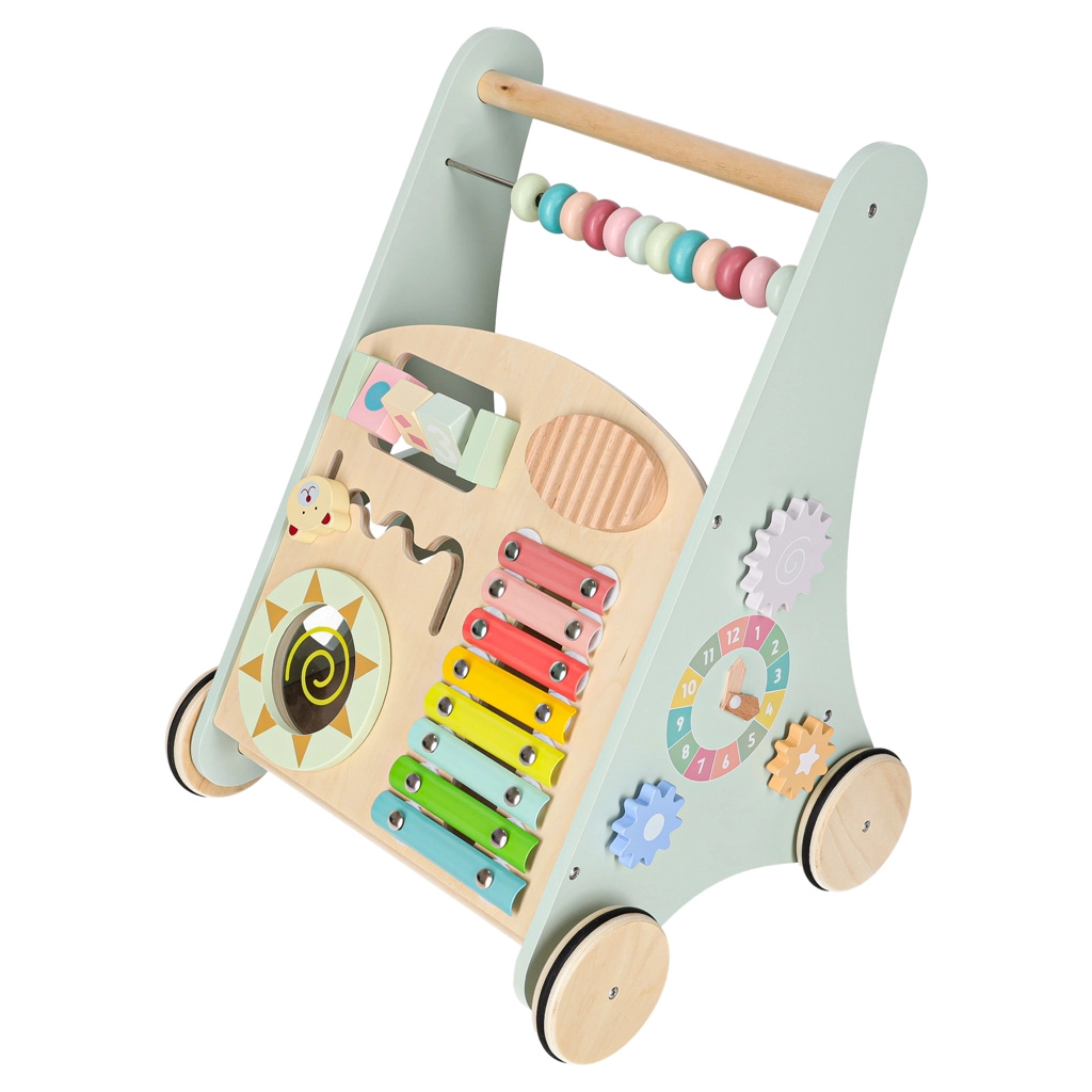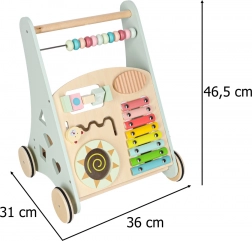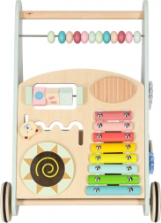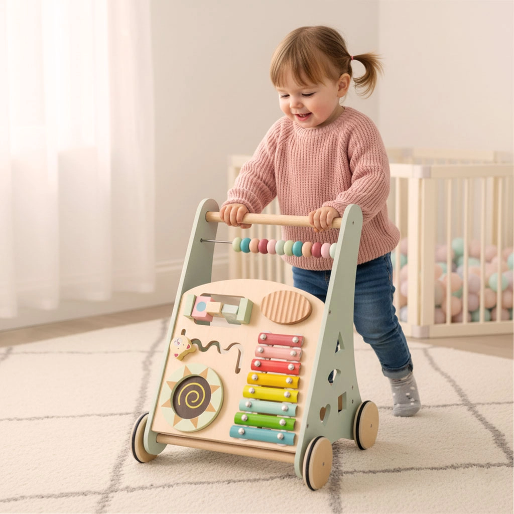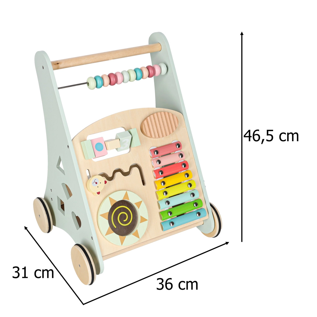 Multifunkčné drevené chodítko kombinuje oporu pri prvých krôčikoch s hravým centrom aktivít. Dieťa trénuje rovnováhu, koordináciu ruka–oko aj jemnú motoriku pri posúvaní, roztočení či vkladaní tvarov. Pastelové farby a hladko opracované drevo lákajú k objavovaniu, zatiaľ čo xylofón podporuje rytmus a hudobný sluch.