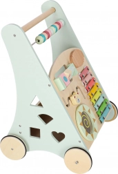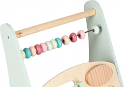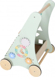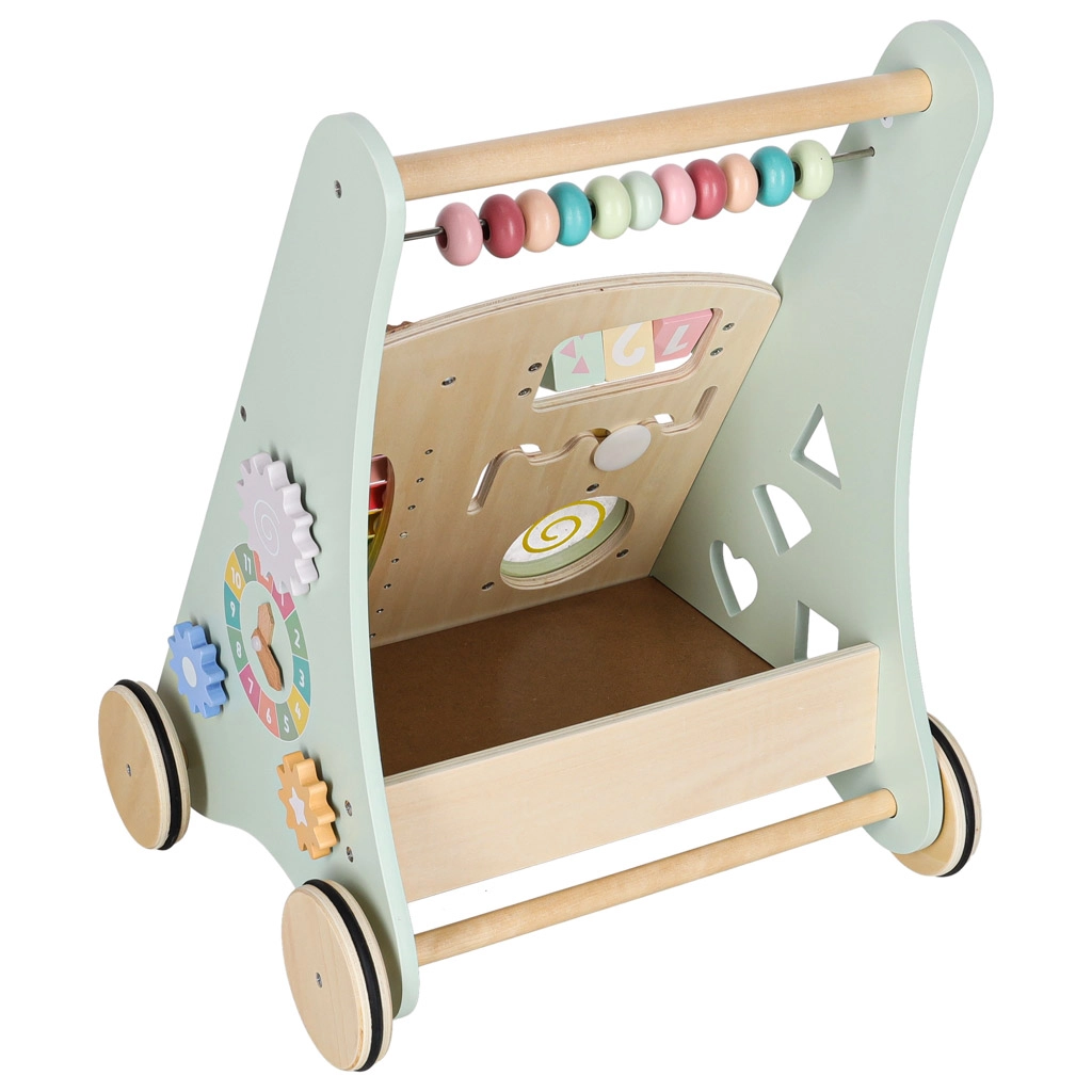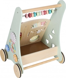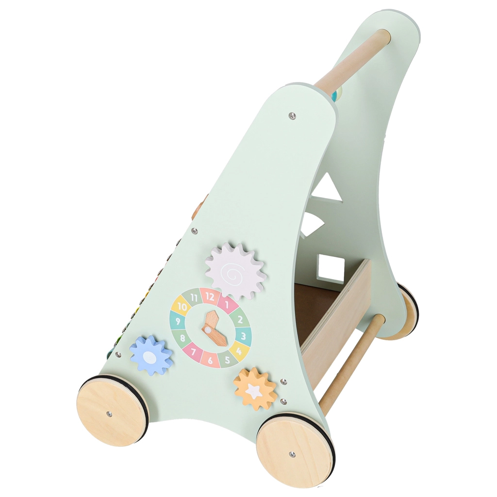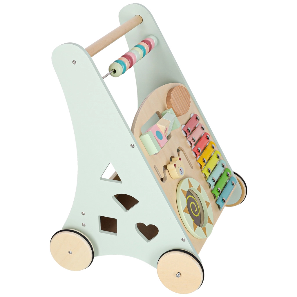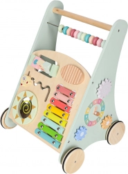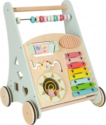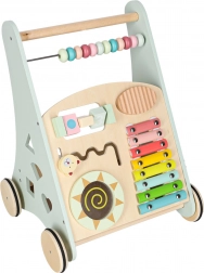 Multifunkčné drevené chodítko kombinuje oporu pri prvých krôčikoch s hravým centrom aktivít. Dieťa trénuje rovnováhu, koordináciu ruka–oko aj jemnú motoriku pri posúvaní, roztočení či vkladaní tvarov. Pastelové farby a hladko opracované drevo lákajú k objavovaniu, zatiaľ čo xylofón podporuje rytmus a hudobný sluch.