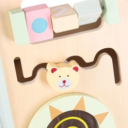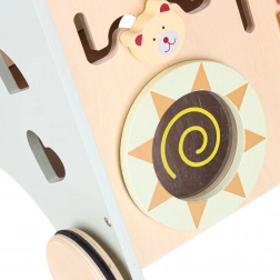 Na čelnom paneli čaká xylofón s paličkami, počítadlo pre prvé kroky v počítaní a triediaca škatuľa tvarov na učenie farieb a tvarov. Ozubené kolieska, labyrint s korálkami a hodiny rozvíjajú logické myslenie a chápanie príčiny a následku. Gumové obrúčky kolies zabezpečujú lepšiu priľnavosť a tichý chod.