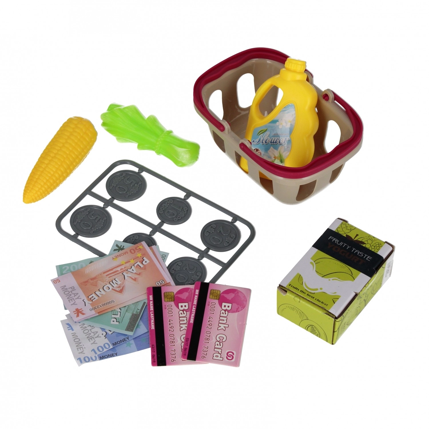Súčasťou sú plastové potraviny, košík, herné bankovky a mince – všetko potrebné pre kompletnú hru na obchod.