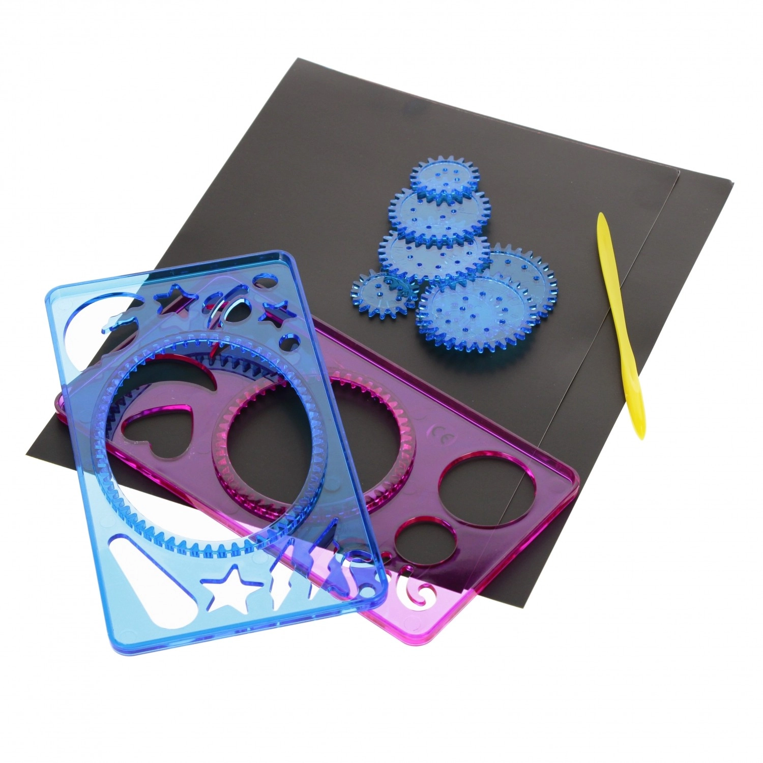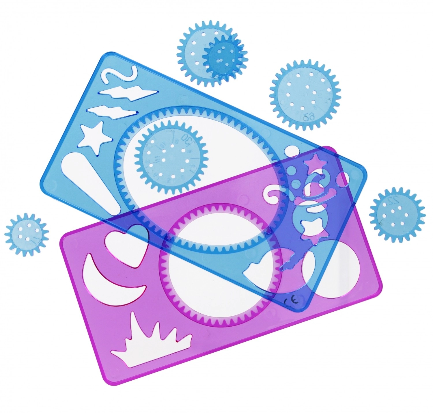 Dve pevné, priehľadné dosky so zubatými krúžkami a tvarmi umožňujú presné vedenie koliesok a čisté línie aj pri zložitých vzoroch.