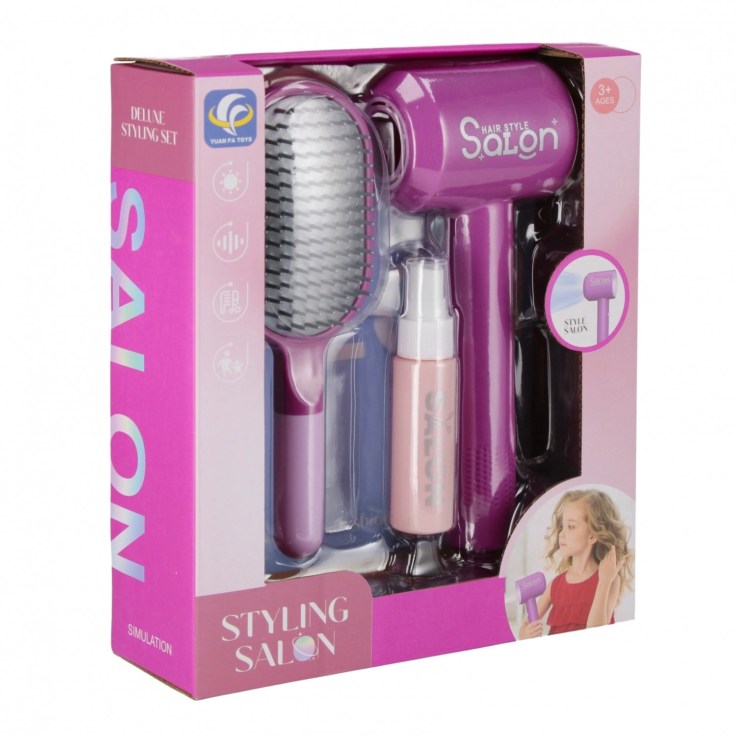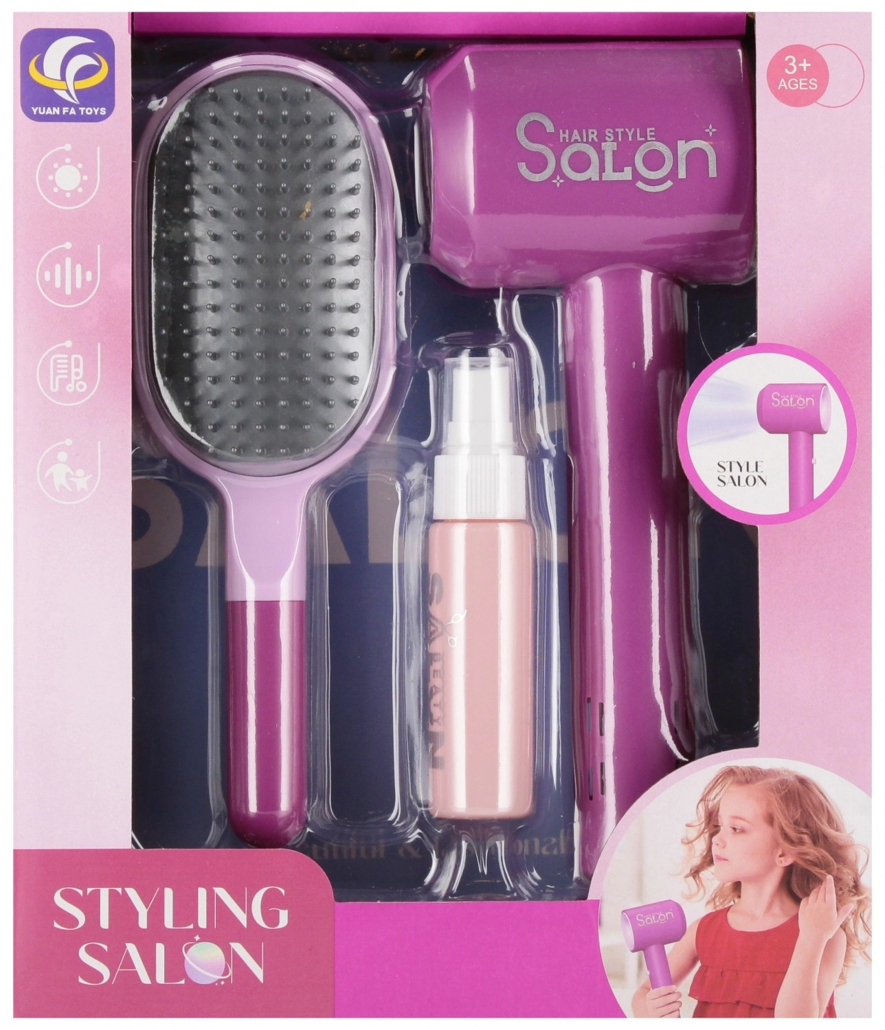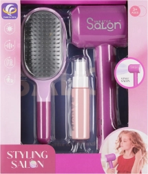 - Obsah sady: fén na batérie, kefa, hrebeň, sprej na vlasy a ďalšie doplnky