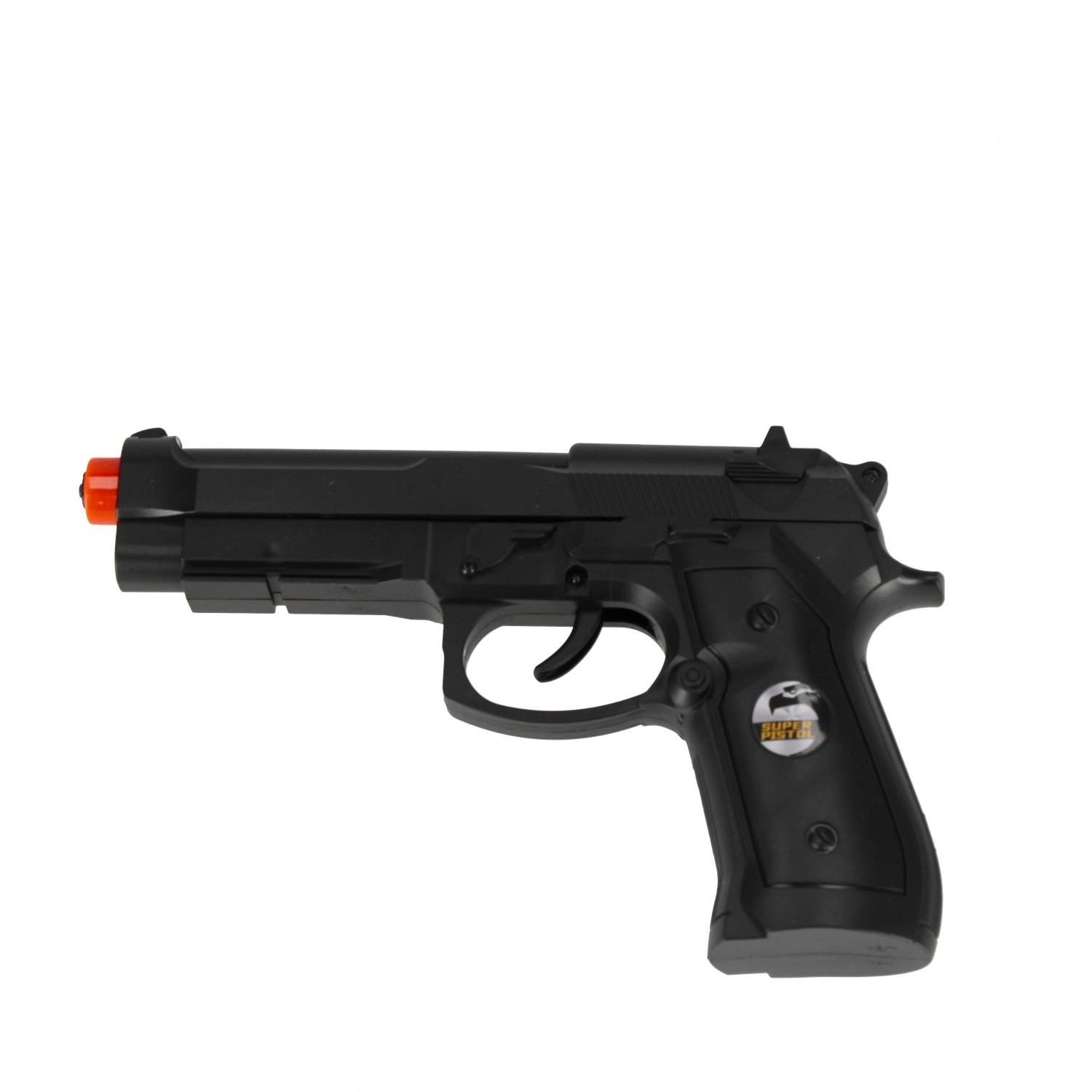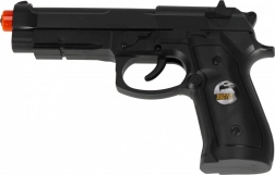 Realisticky tvarovaná detská pištoľ s oranžovým koncom pre bezpečnú hru. Textúrovaná rukoväť a ľahká konštrukcia pre pohodlné držanie.
