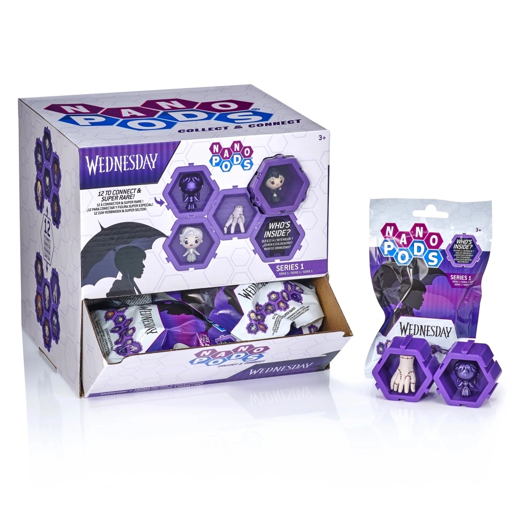 Séria Nano Pods prináša kompaktné zberateľské figúrky zo sveta WEDNESDAY, uložené v prepojiteľných šesťhranných puzdrách. Každé balenie skrýva jednu náhodnú postavu, takže rozbaľovanie je plné napätia a zábavy. Vďaka šikovnému dizajnu kapsúl si ľahko vytvoríte vlastnú výstavnú stenu alebo kreatívne obrazce.