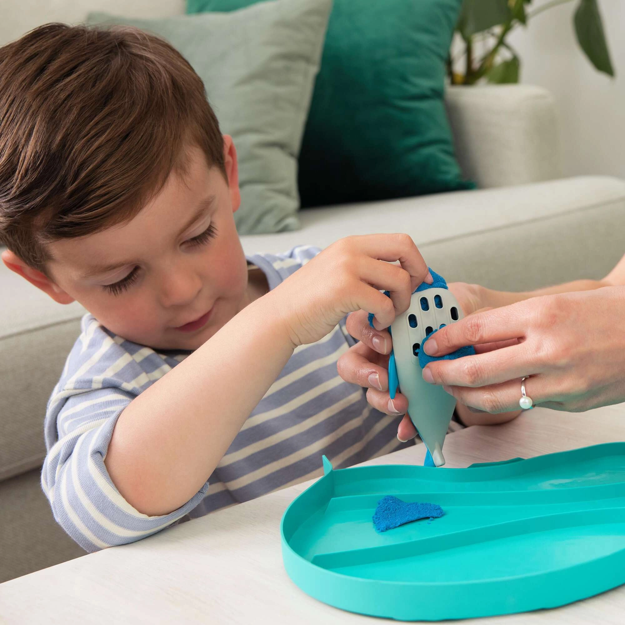 Kinetický piesok Kinetic Sand napodobňuje pocit mokrého piesku, ale bez špiny a vysychania. Deti môžu ľahko modelovať, krájať, stláčať a stavať, pričom si precvičujú koordináciu a tvorivosť. Set Deep Sea ponúka kombináciu modrej, bielej a zelenej na tvorbu zábavných podmorských scén a tvarov.