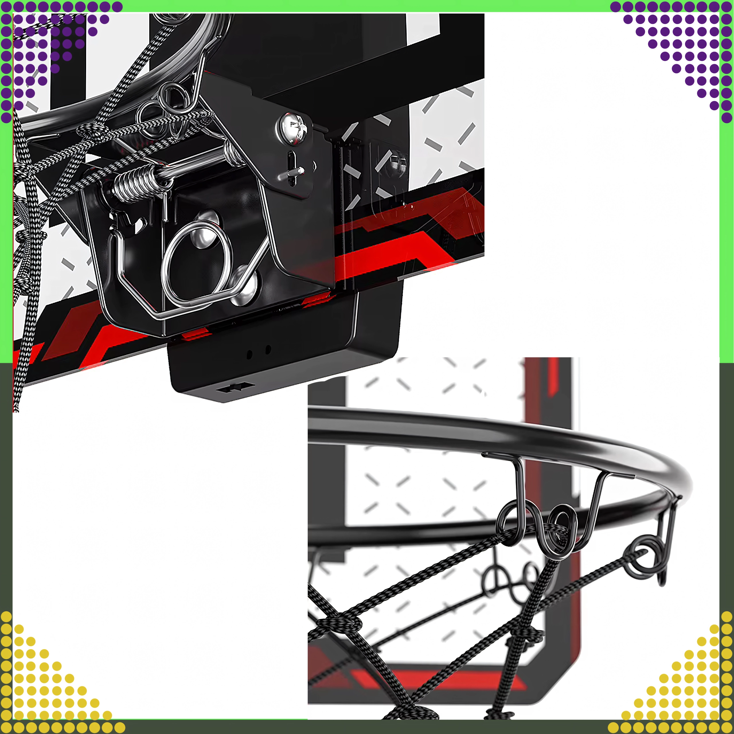 Pružinový mechanizmus pohlcuje nárazy pri dopade lopty a chráni konštrukciu. Sieť je spletená pre dlhú životnosť a plynulý odskok.