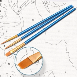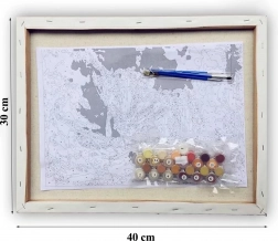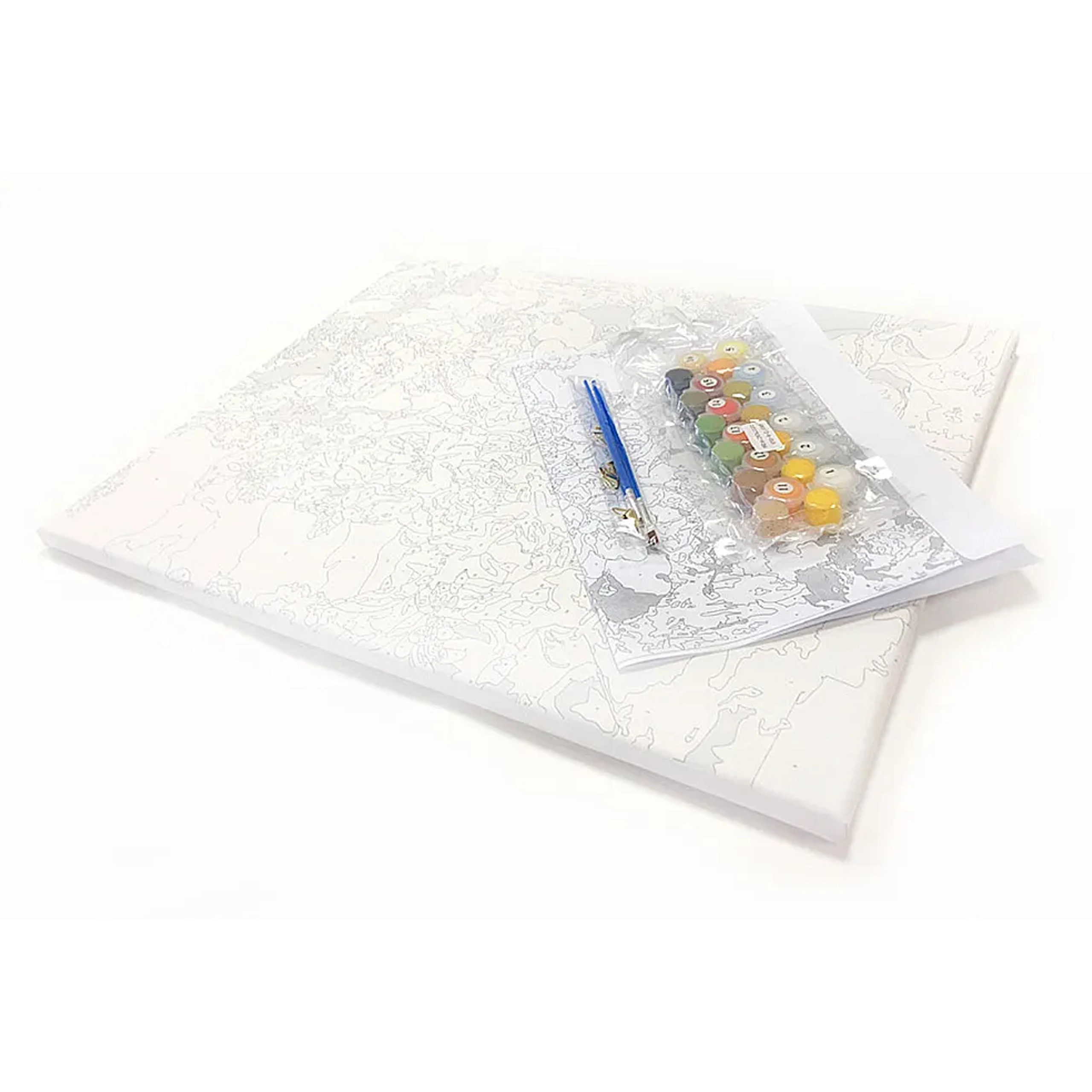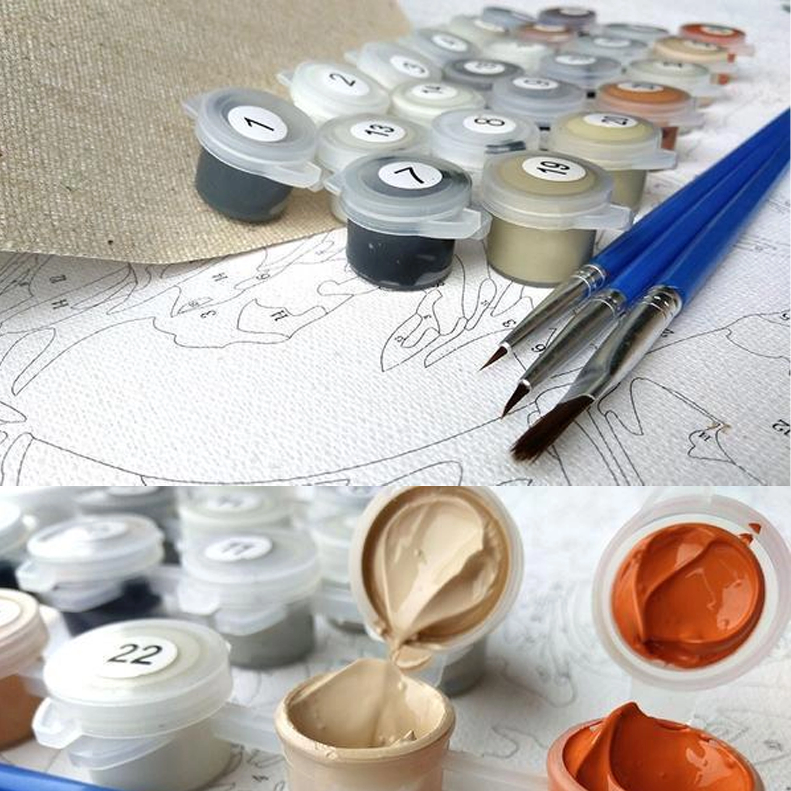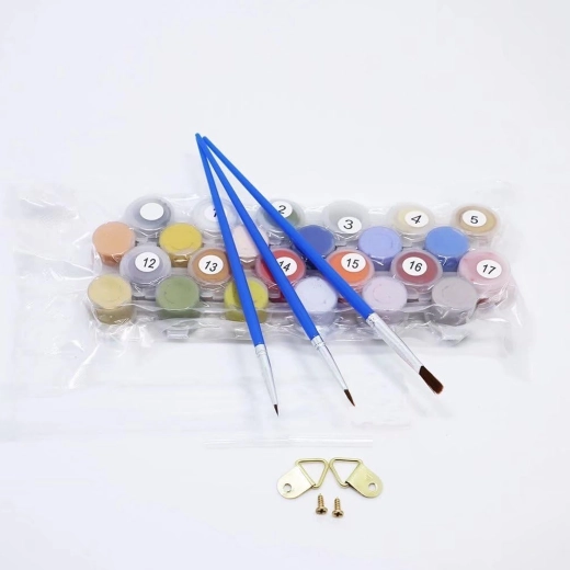 V balení nájdete všetko, čo potrebujete – pretláčané plátno, sadu farieb v kelímkoch, štetce a referenčnú predlohu pre istý výsledok.