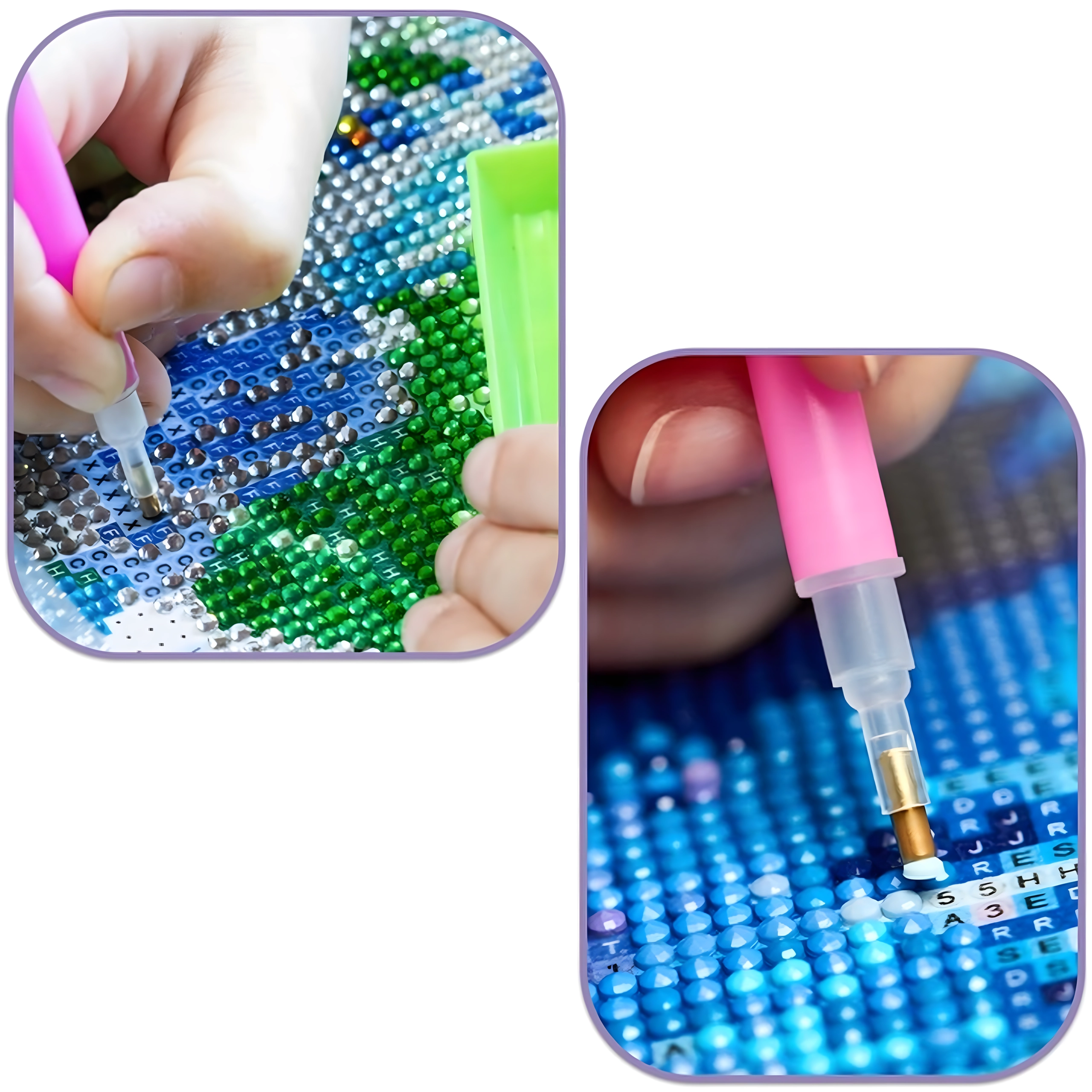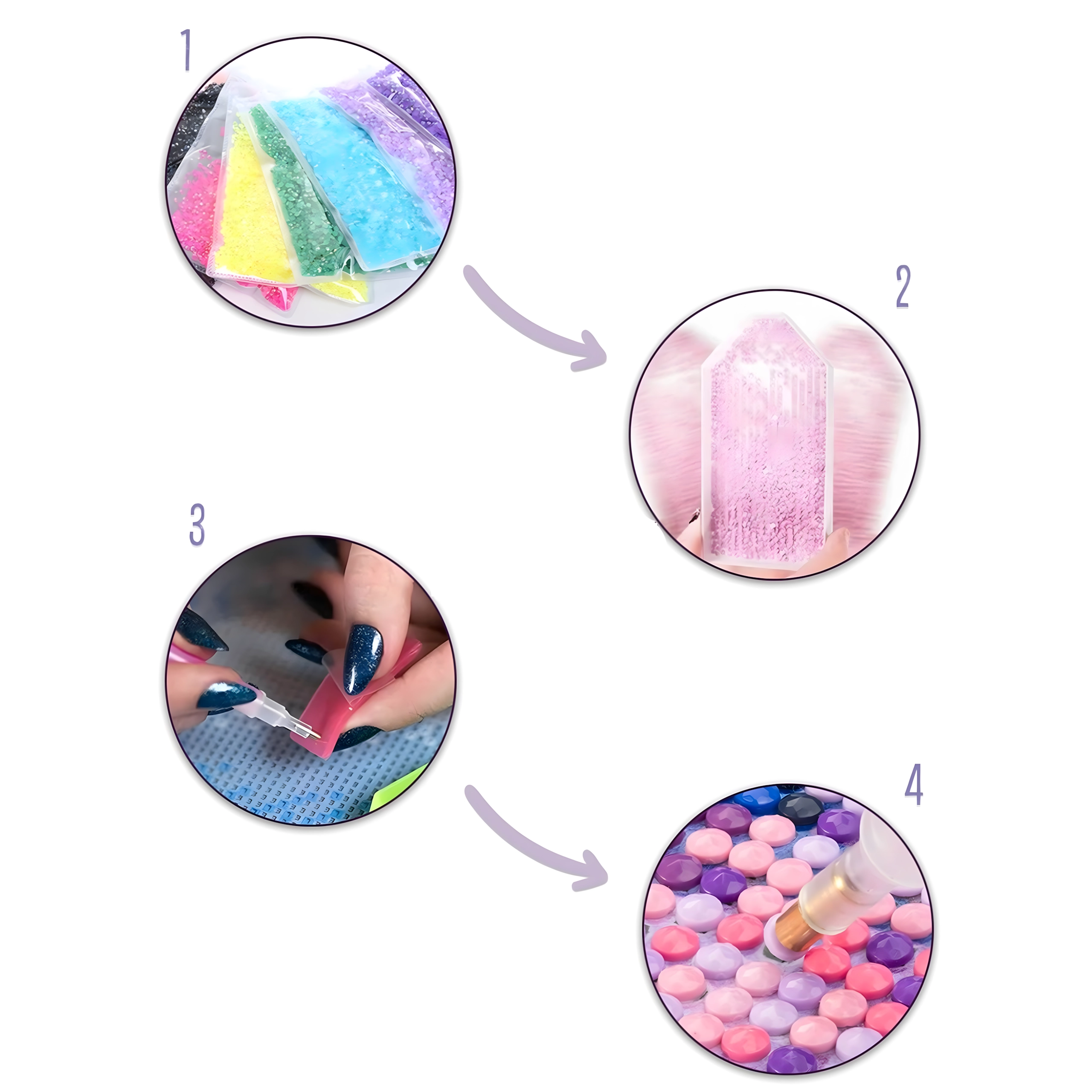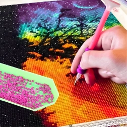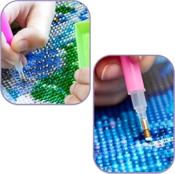 Všetko potrebné máte hneď po ruke: samolepiace plátno s potlačou, trblietavé kamienky (drilly), aplikačné pero, vosk aj triediacu tácku. Presné nástroje a viac-umiestňovacie nadstavce urýchlia prácu a zaručia čistý, rovnomerný výsledok.