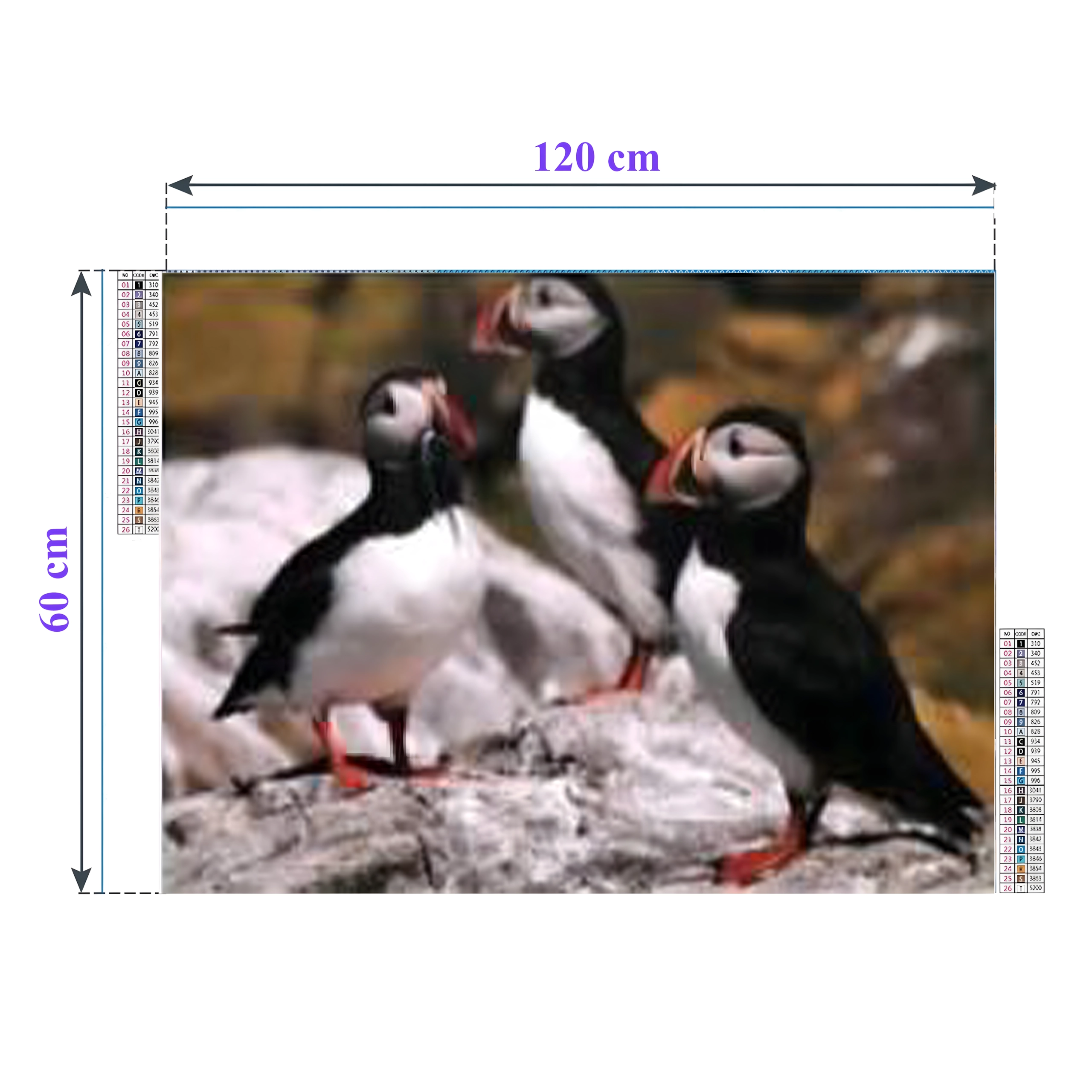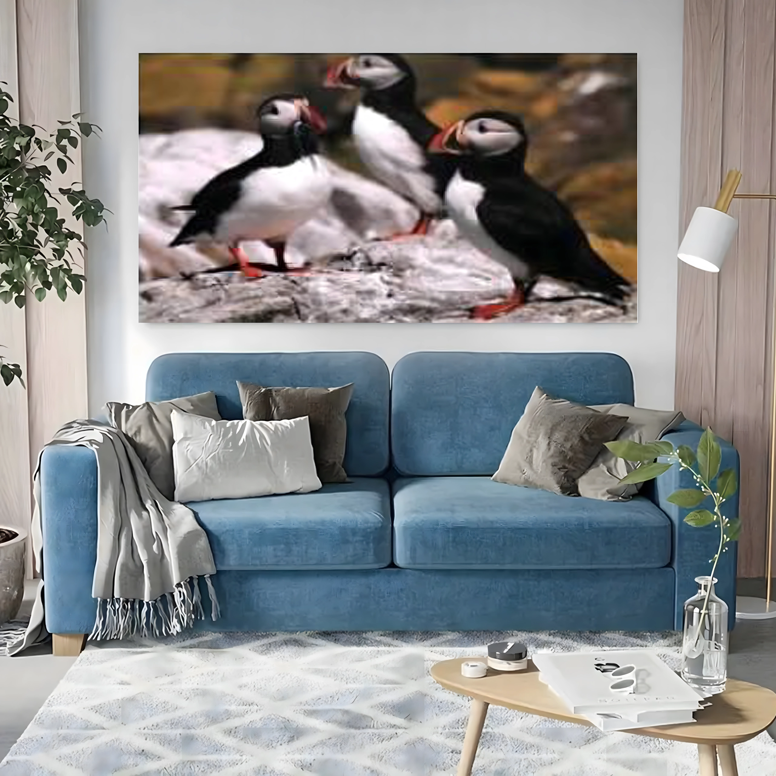 Fotograficky ladený vzor troch maskonosov na skalách dodá interiéru farbu, kontrast a prírodnú atmosféru. Perfektné ako dominantná nástenná dekorácia.