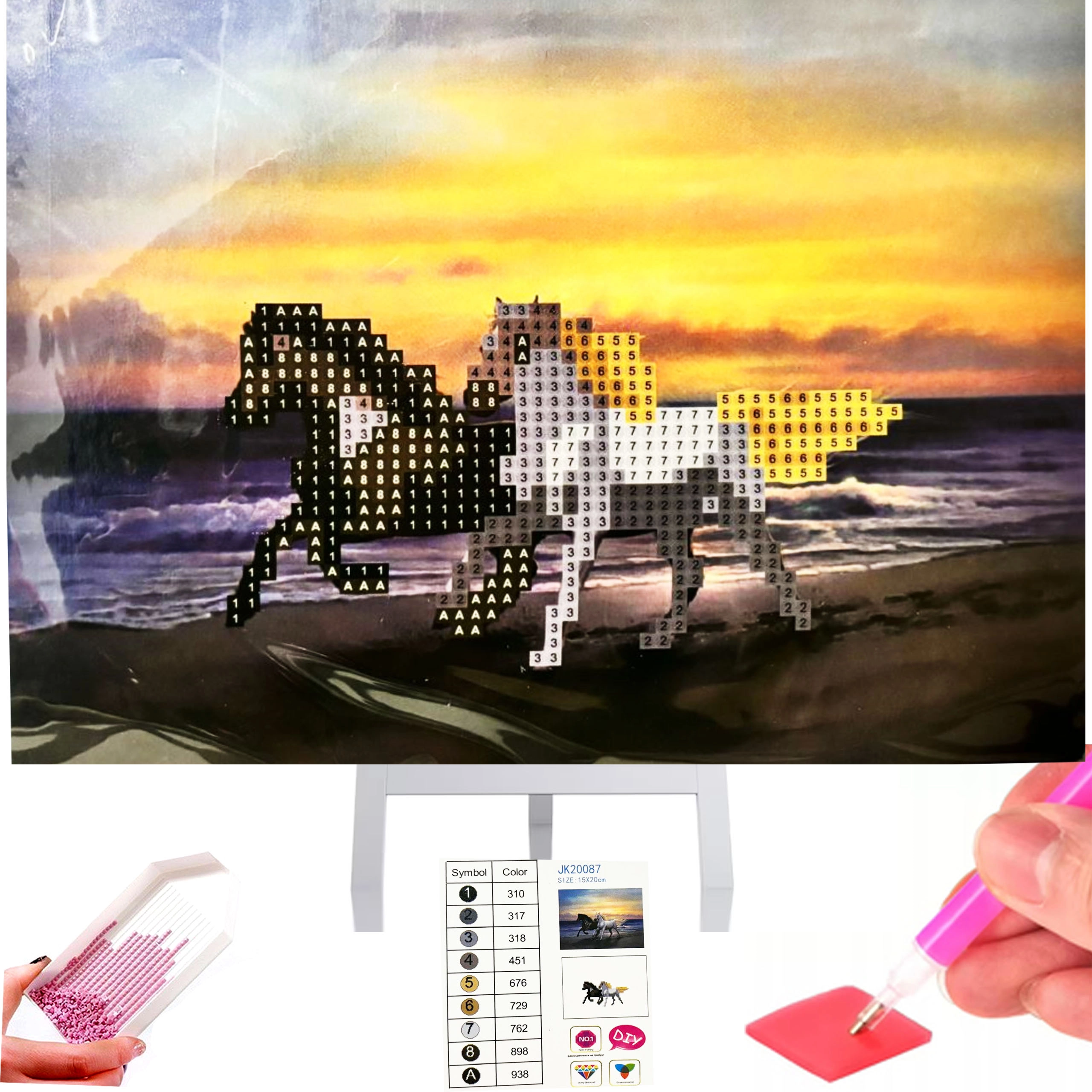 Tento kompletný set na diamantové maľovanie (mozaika z lesklých kamienkov) ponúka jednoduchý a príjemný spôsob, ako vytvoriť vlastné trblietavé dielo. Plátno s predtlačenými symbolmi a samolepiacou vrstvou vám presne ukáže, kam jednotlivé kamienky umiestniť. Kompaktný formát 15 × 20 cm je ideálny pre deti aj úplných začiatočníkov.
