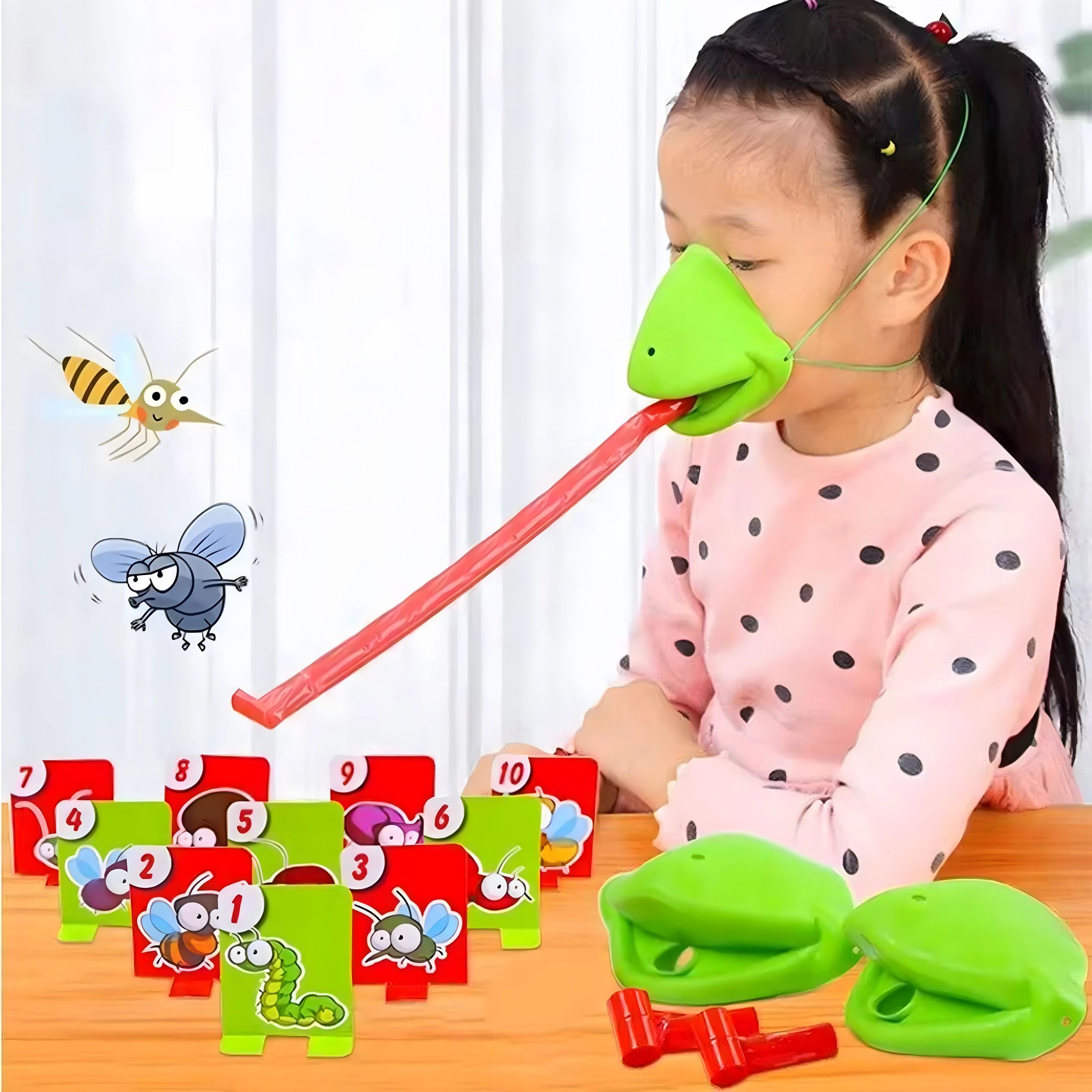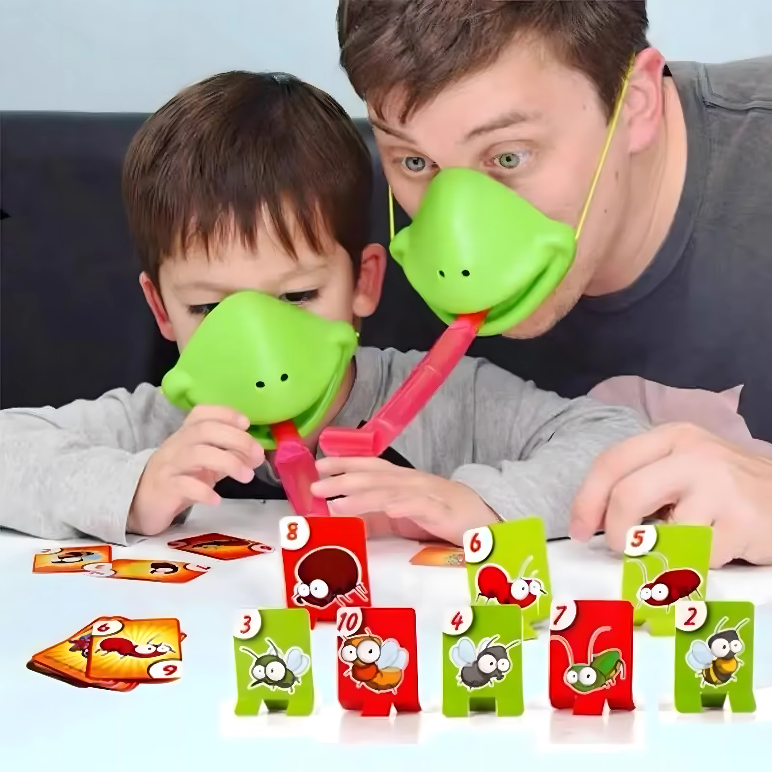 Vďaka nastaviteľným elastickým pásikom masky dobre držia, pružný jazyk zaisťuje akčnú a bezpečnú hru a farebné karty s hmyzom podporujú vnímanie čísel, pozornosť a koordináciu oko–ruka. Skvelé na rodinné večery, detské oslavy aj priateľské klania.
