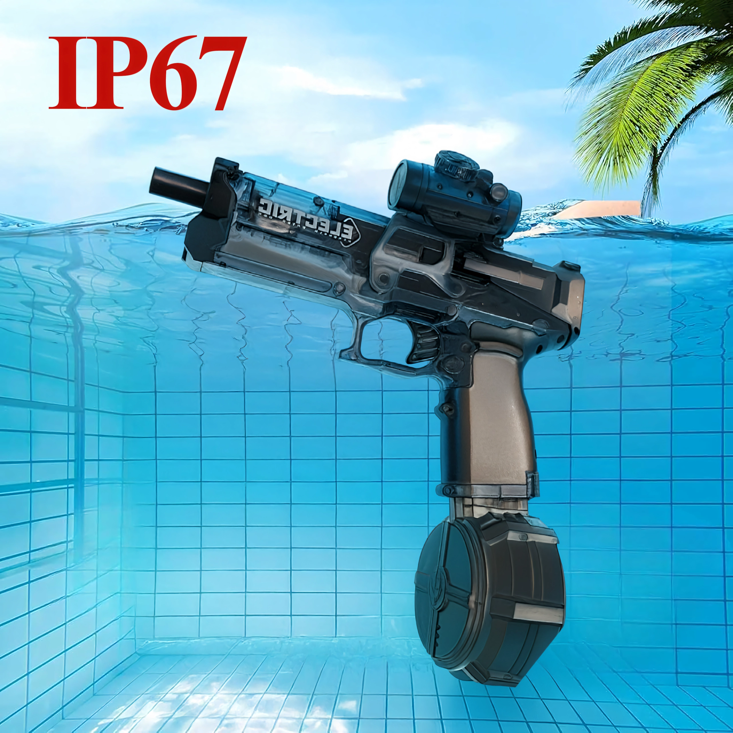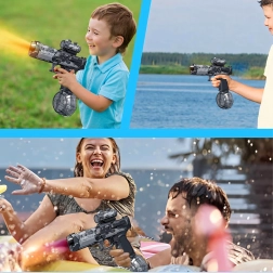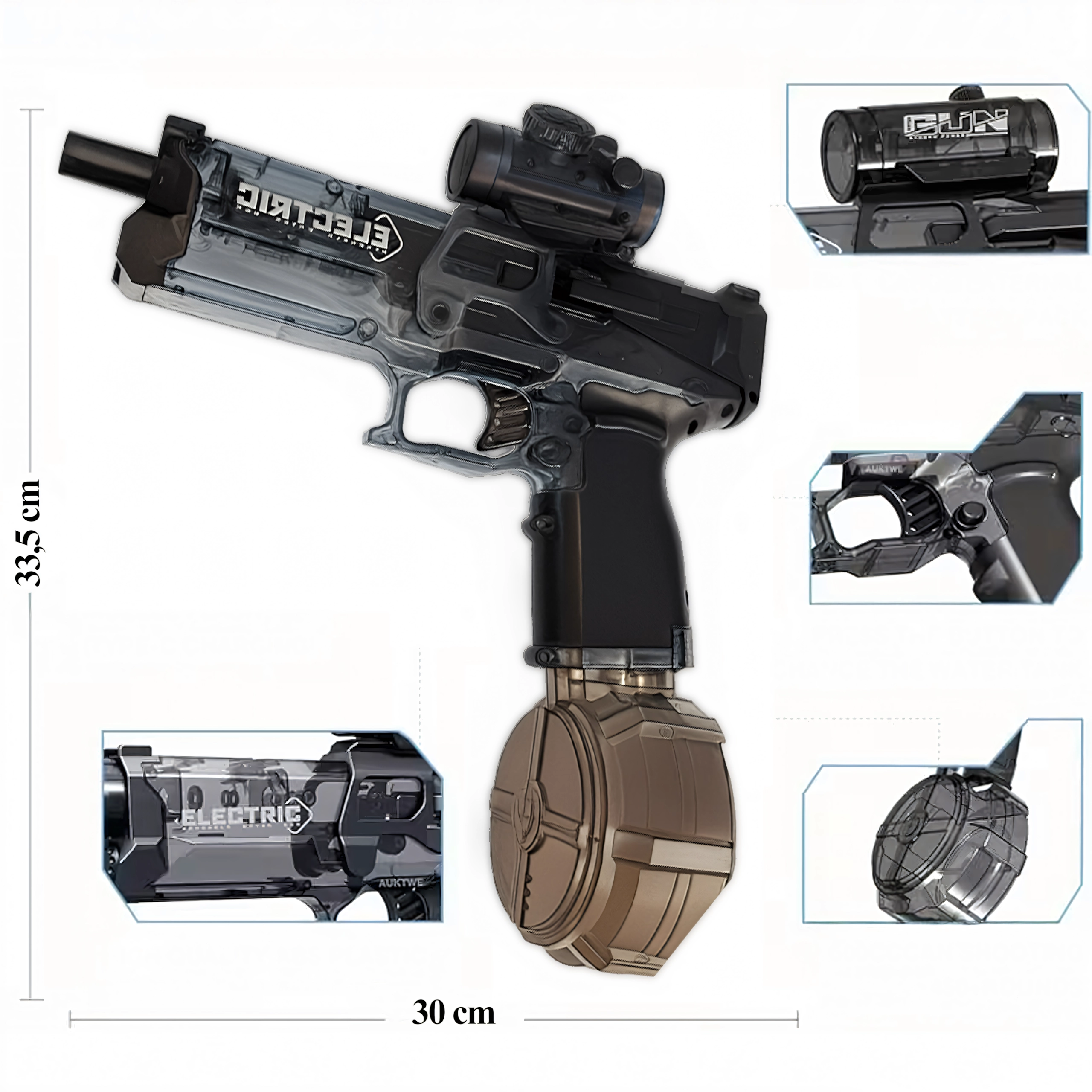 Táto výkonná elektrická vodná pištoľ prináša dynamickú a pohodlnú hru pre deti aj dospelých. Vďaka automatickému spúšťaniu strieľa súvislý prúd vody bez potreby pumpovania, zatiaľ čo kapacitný zásobník zabezpečuje menej časté dopĺňanie. Vstavaná nabíjacia batéria cez USB poskytne až 35 minút zábavy na jedno nabitie.
