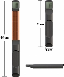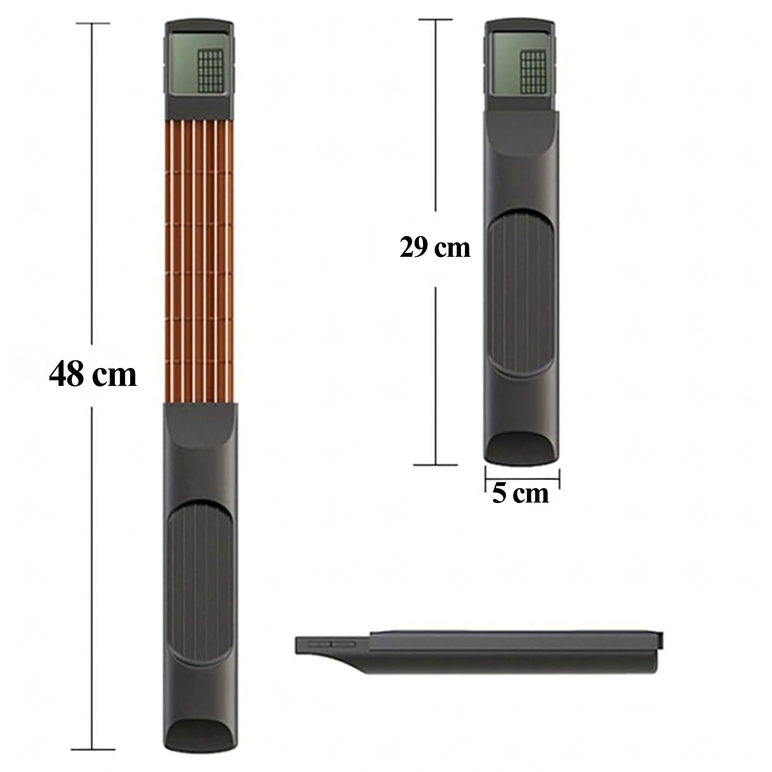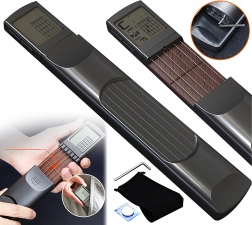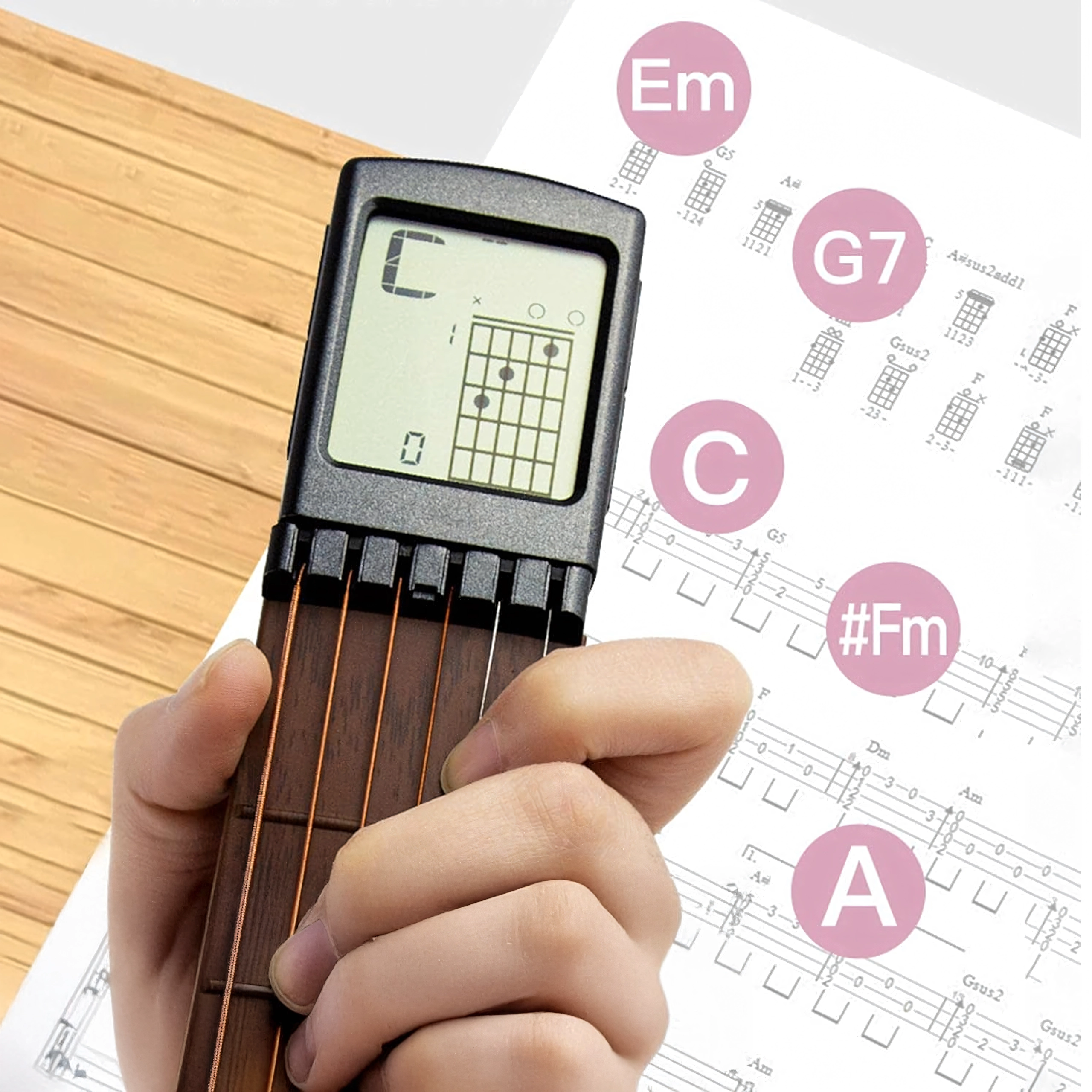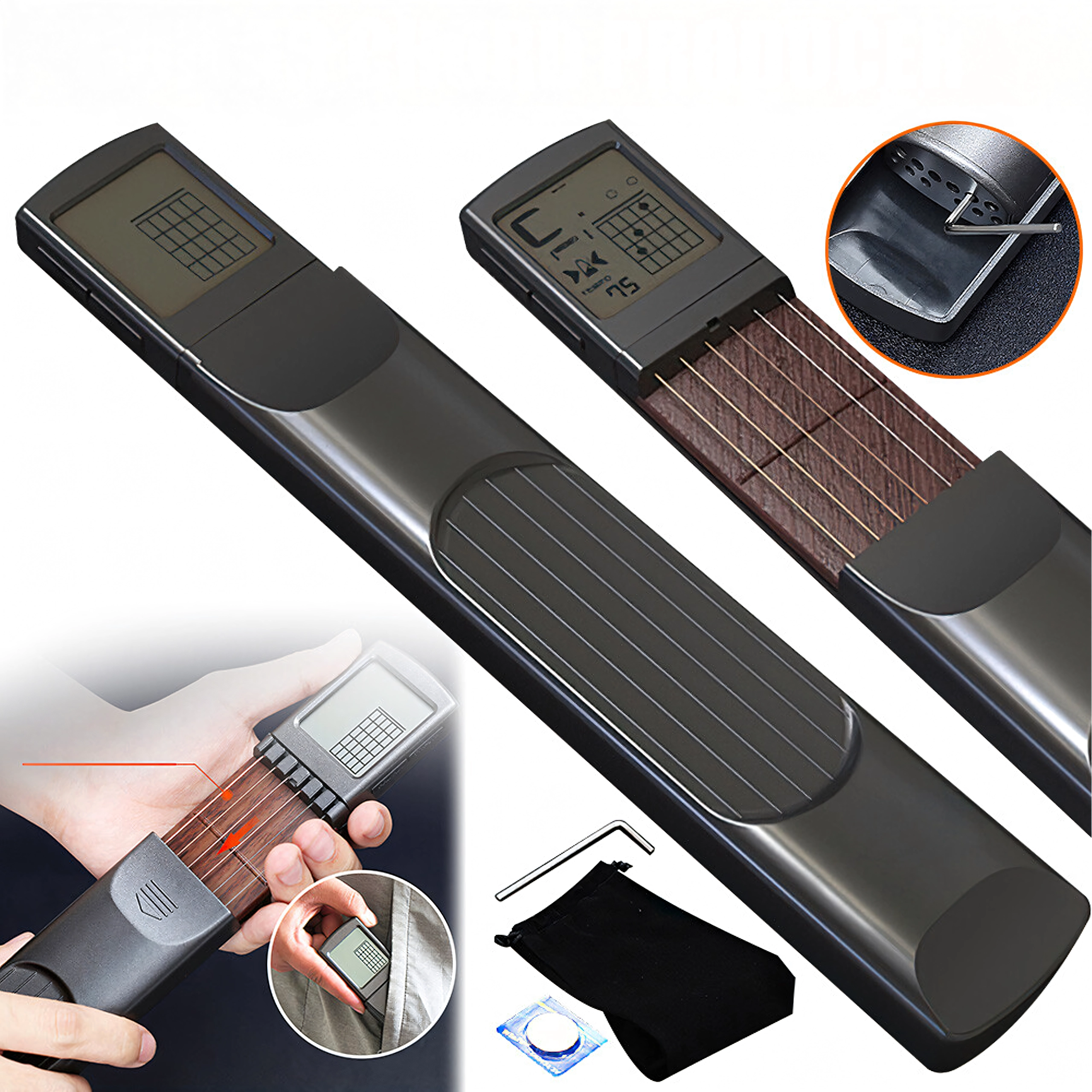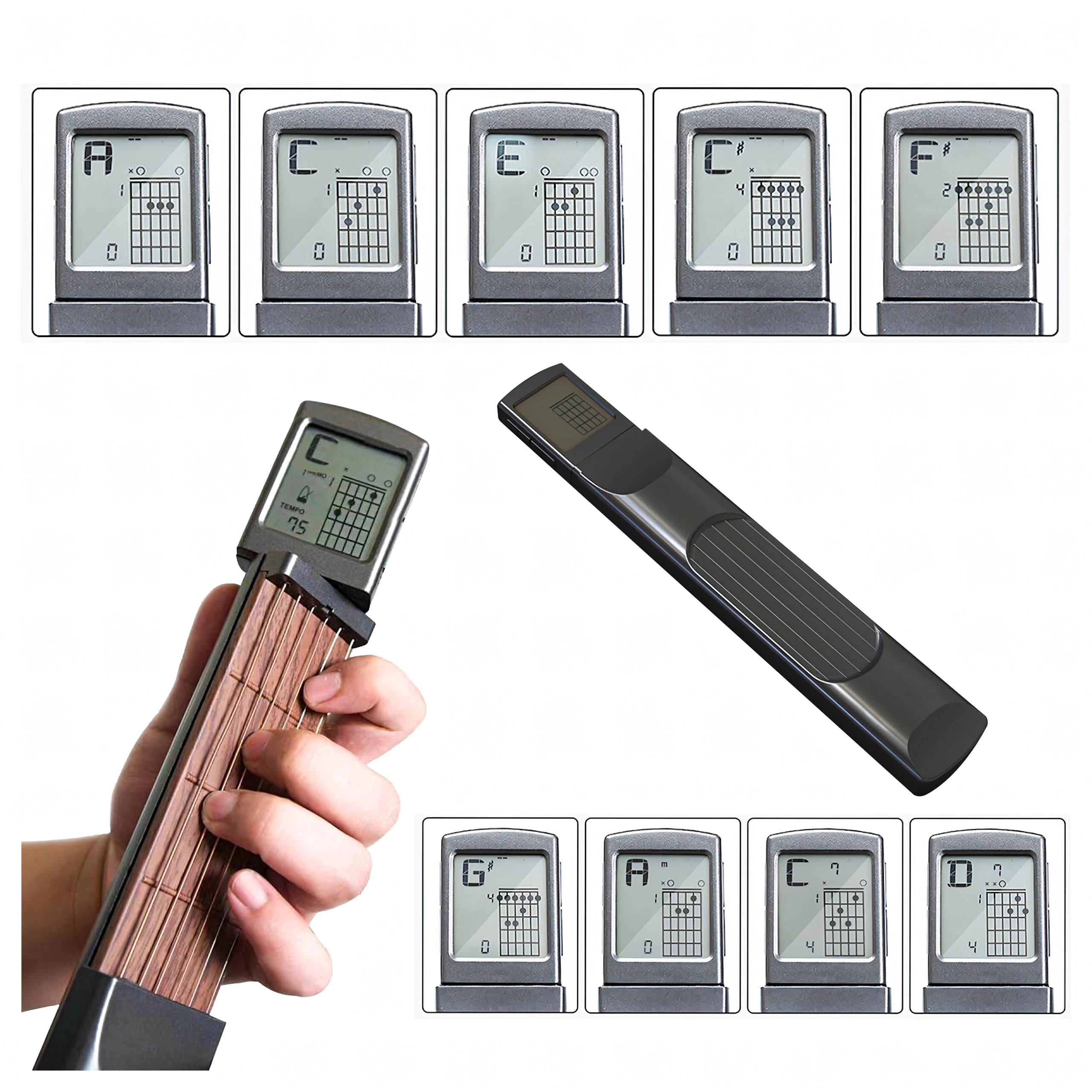 Trénujte akordy, prstoklad a prechody medzi akordmi bez rušenia okolia. Prenosný cvičný hmatník s krátkou menzúrou simuluje reálny pocit z hry vďaka oceľovým strunám, zatiaľ čo LCD displej zobrazuje diagramy akordov, tempo metronómu a užitočné indikácie pre rýchle učenie.