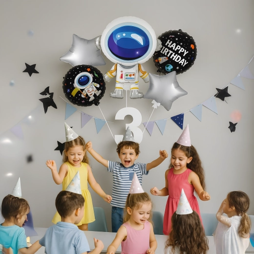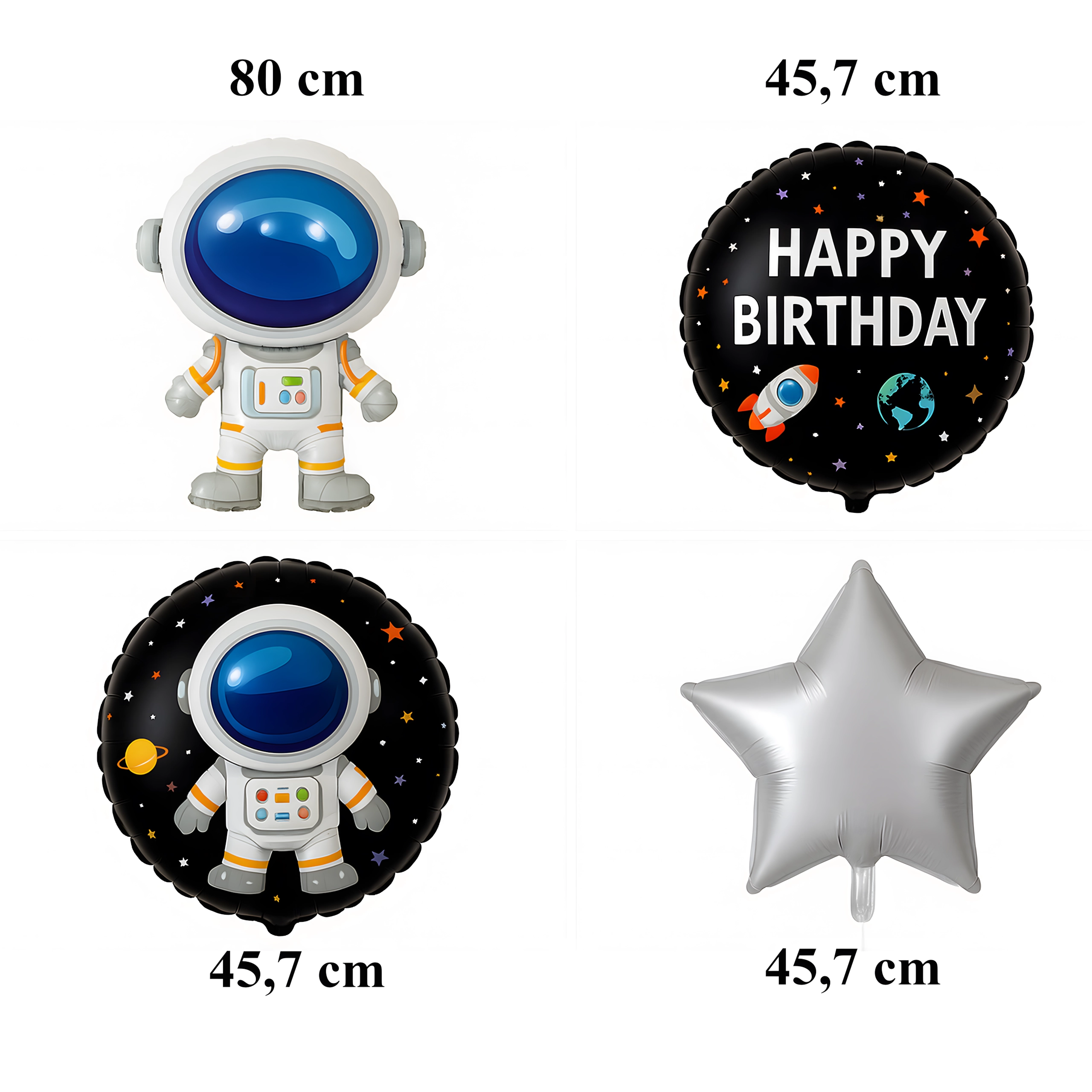 Štýlová sada fóliových balónikov s motívom vesmíru obsahuje astronauta a hviezdičky, ideálna na narodeniny, tematické párty a ako dekorácia do detskej izby. Skvelé tiež pre fotokútik a nezabudnuteľné oslavy.