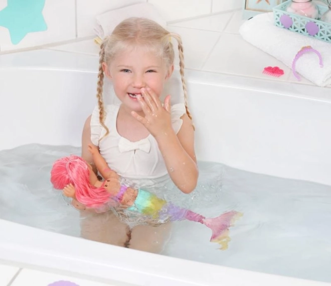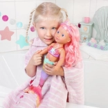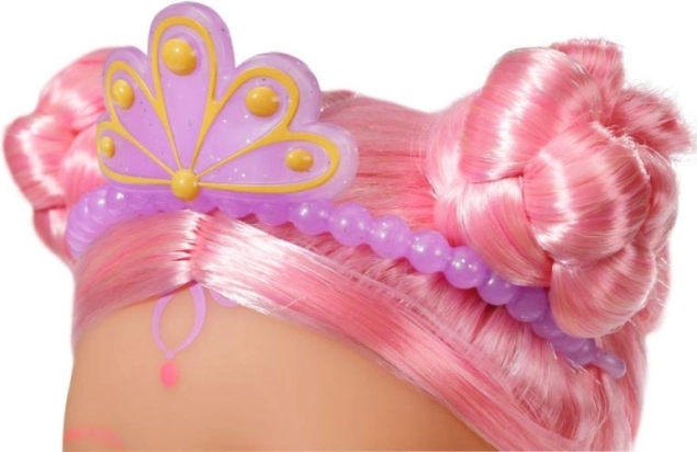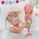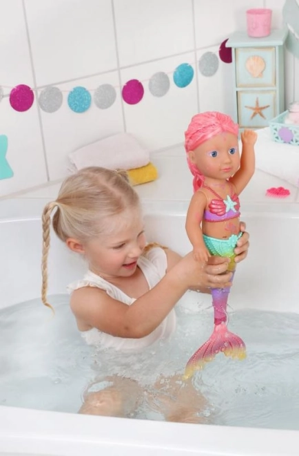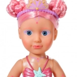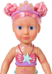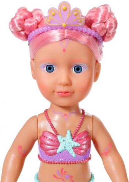 BABY born Little morská princezná je neodolateľná bábika s dlhými ružovými vlasmi, ktoré sú ozdobené fialovou čelenkou. Plutva bábiky je nádherne farebná, trblietavá a pri kontakte s vodou sa hýbe, čo vytvára magickú atmosféru. Má plavky s mušľovým dizajnom, ktoré dokonale ladia s chvostovou plutvou.