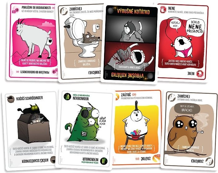 Výbušné mačiatka: Prísprostá edícia je dospelá verzia celosvetového hitu, ktorý sa stal najúspešnejšou hrou na Kickstarteri. Hráči si ťahajú karty a snažia sa vyhnúť karte Výbušné mačiatko. Kto ju otočí a nemá Zneškodni, exploduje a z hry vypadáva. Ostatné karty pomáhajú prežiť – alebo naopak nastražiť pascu súperom.