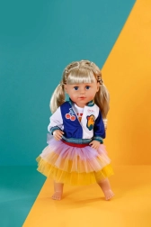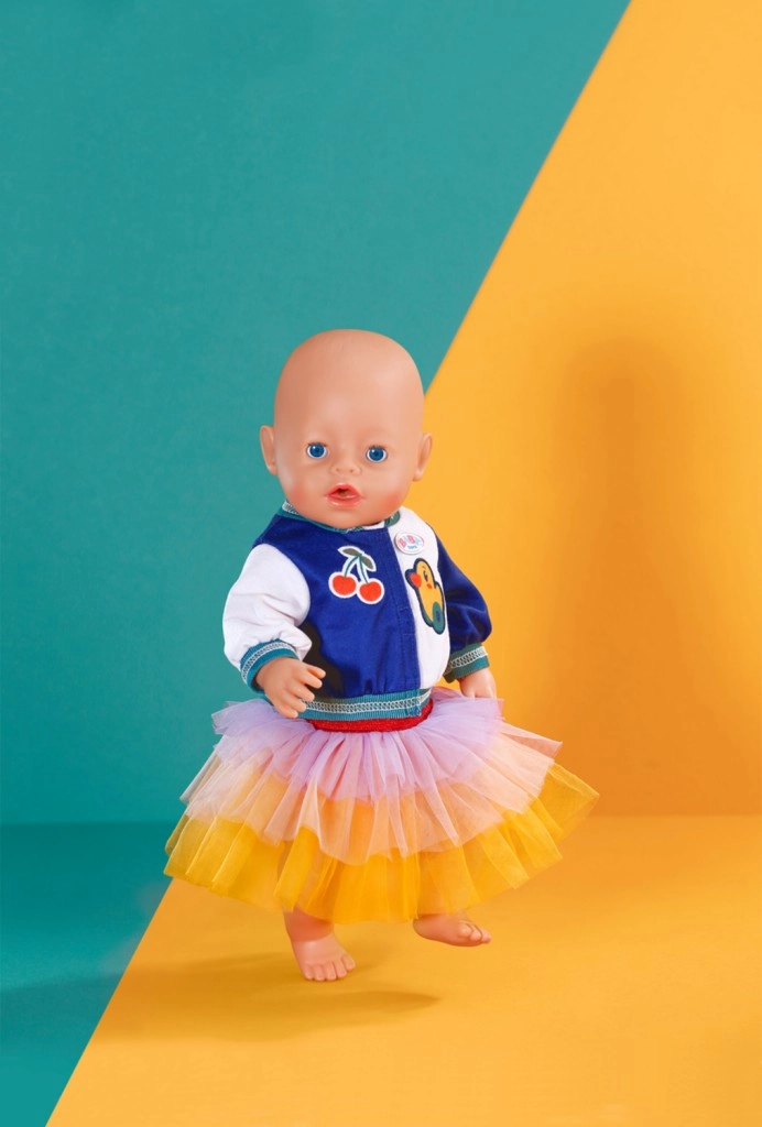 Doprajte svojej bábike hravý a módny vzhľad. Tento outfit kombinuje pohodlné tričko s tigríou tvárou, cool dvojfarebnú bundu a nadýchanú tutu sukňu v žiarivých farbách žltej, oranžovej a fialovej. Skvele sa hodí na každodenné hranie aj špeciálne príležitosti.