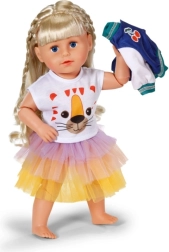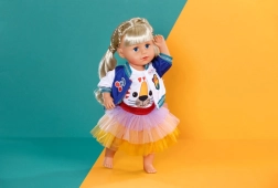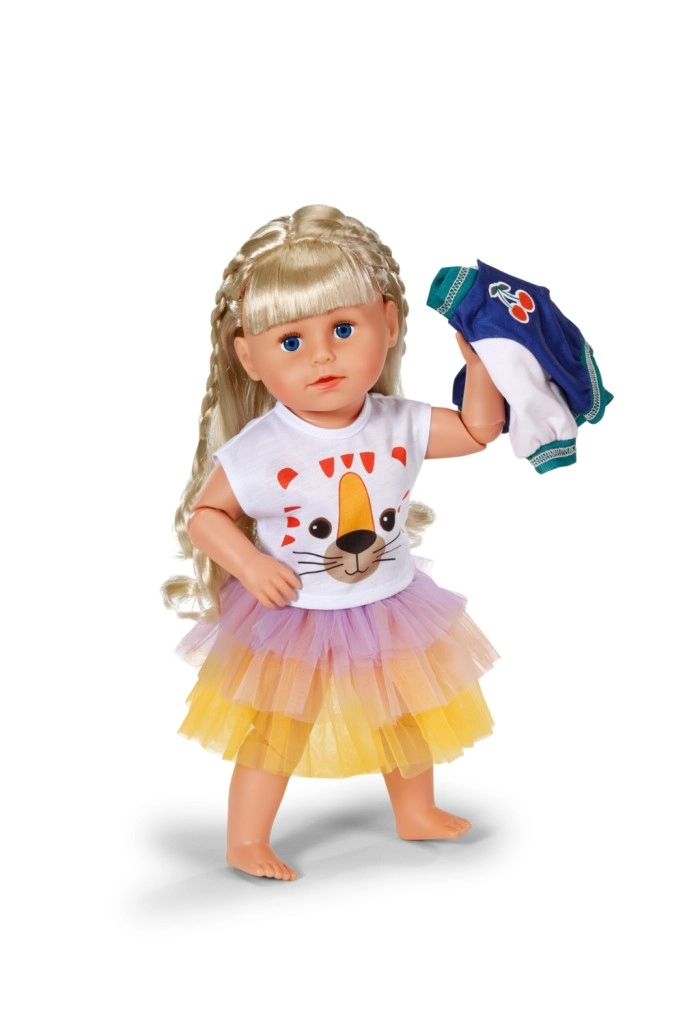 Štýlový set pre bábiky BABY BORN prinesie do každého dňa farebný akcent. Obsahuje tričko s tigríou tvárou, dvojfarebnú bundu a tutu sukňu v žltej, oranžovej a fialovej. Vhodné pre bábiky 43 cm aj pre medvedíkov BABY BORN Teddy. Súčasťou je ramienko z recyklovaného materiálu a kvalitné spracovanie pre dlhotrvajúcu hru.