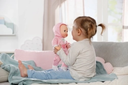 Bábika má mäkké látkové telíčko ideálne na maznanie a realistickú hlavičku s jemnými rysmi, ktoré podporujú empatické hranie.