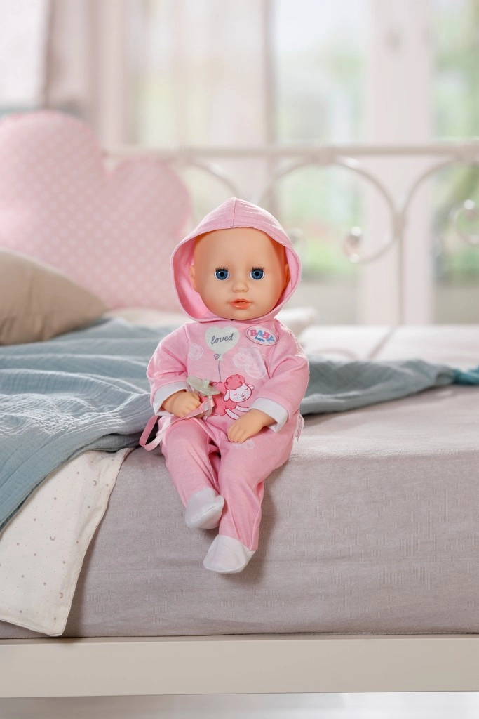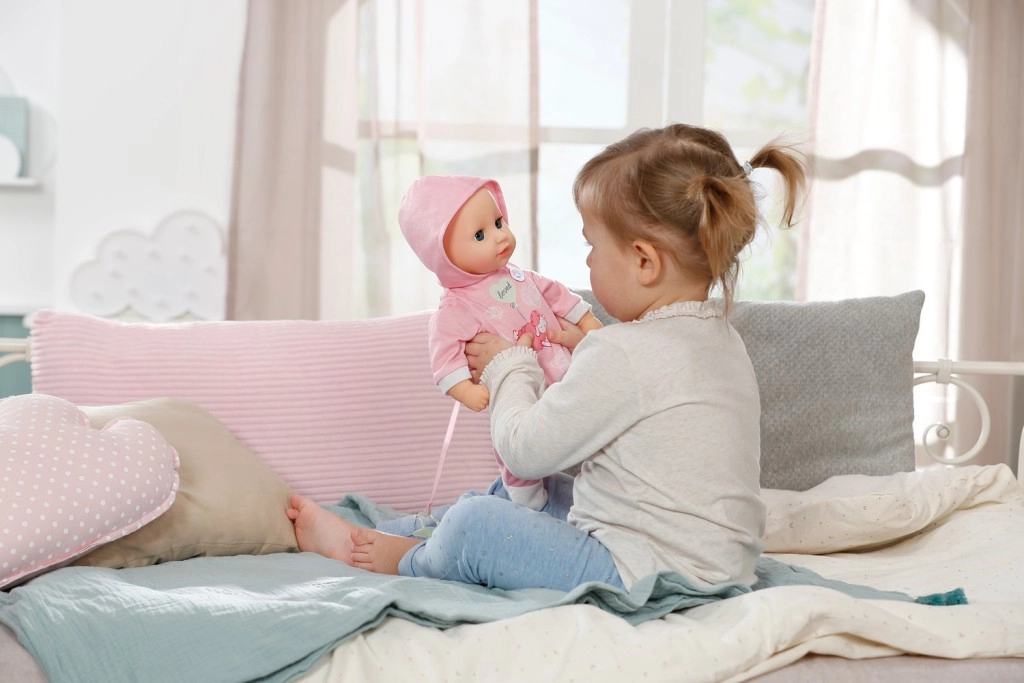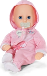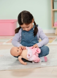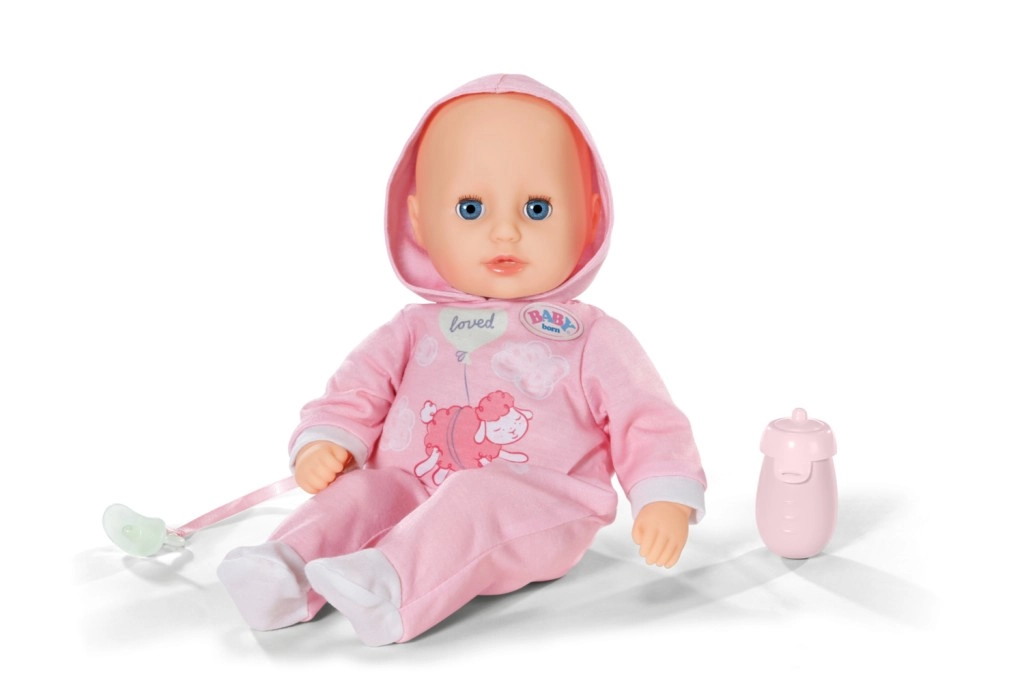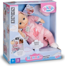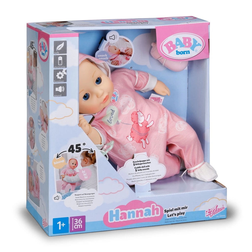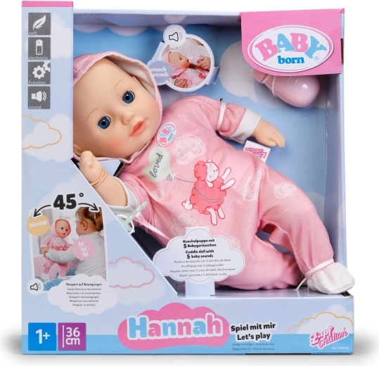 Roztomilá bábika BABY born Hannah s veľkosťou 36 cm je ideálna kamarátka na každodenné hranie a maznanie. Ponúka mäkké látkové telíčko, realistické detské zvuky, vie piť z fľaštičky so zvukmi pitia, zatvára oči a pri uspávaní vydáva jemné, upokojujúce zvuky. Súčasťou balenia je cumlík a fľaštička.