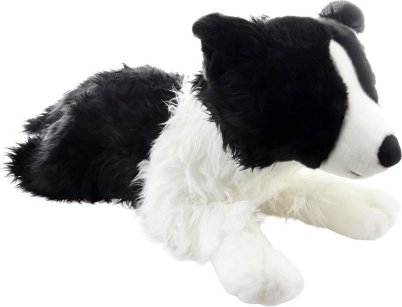 Tento veľký plyšový psík border kólie v ležiacej pozícii poteší na prvý dotyk. Je vyrobený z veľmi jemného, na dotyk príjemného materiálu, ktorý láka k objímaniu a maznaniu. Realistická kombinácia čiernej a bielej srsti a roztomilé uši dodávajú hračke autentický vzhľad.