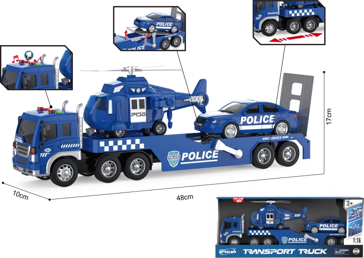 Táto bohato vybavená policajná sada prináša deťom realistické zásahy a záchranné operácie. Odťahové vozidlo s návesom ponúka pohyblivú rampu pre jednoduché nakladanie a vykladanie, zatiaľ čo vrtuľník s otočnými rotormi a záchranným hákom rozširuje možnosti hry. Integrované svetelné a zvukové efekty aktivované tlačidlami na streche kabíny zvyšujú autenticitu.