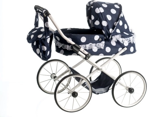 Štýlový kočík pre bábiky v retro dizajne poteší každú malú mamičku. Ponúka čierne prevedenie s bodkami a elegantnou čipkou, nastaviteľnú rukoväť 55 cm pre pohodlné vedenie a sklopnú striešku pre jednoduchú manipuláciu. Súčasťou je taška cez rukoväť a praktický spodný košík na drobnosti.