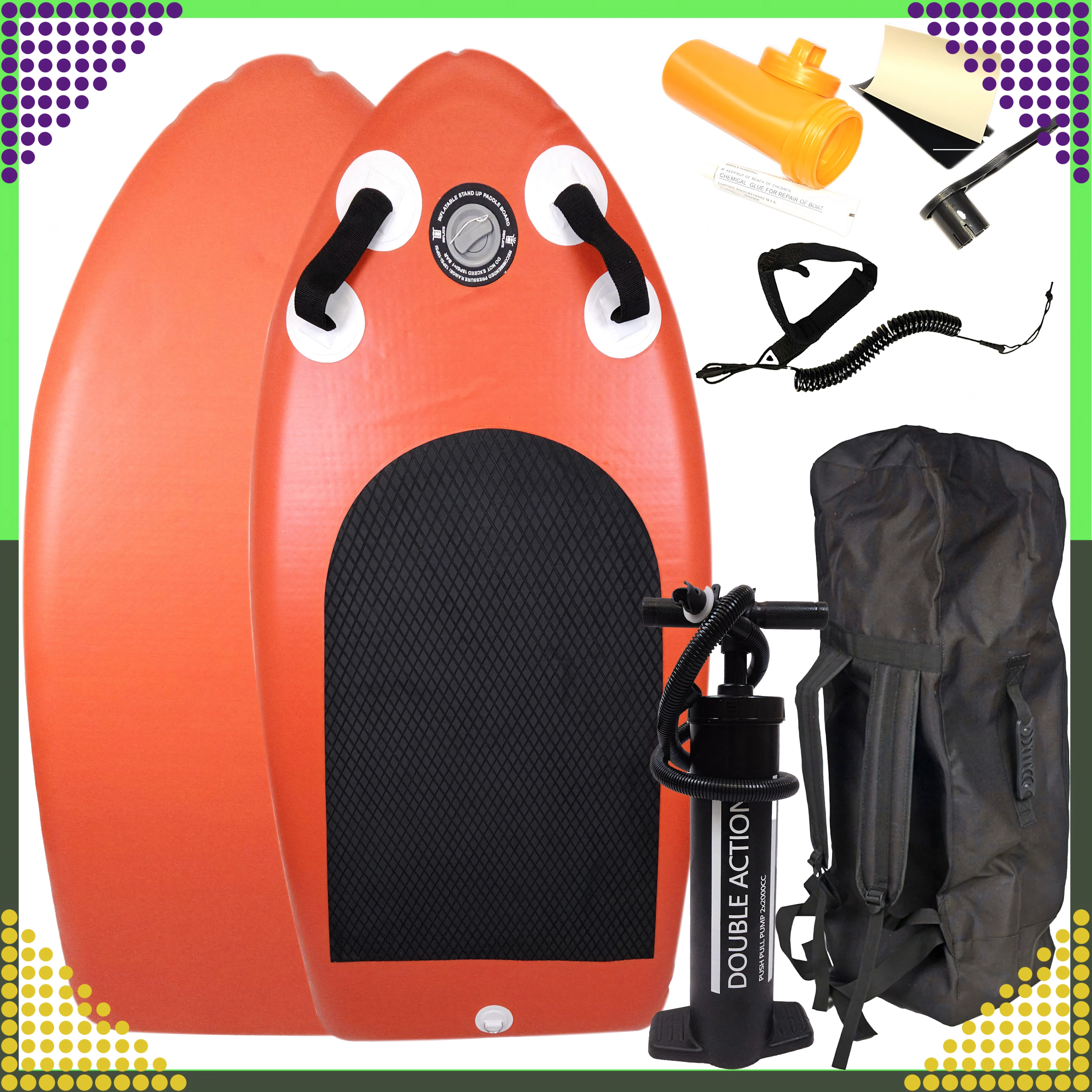 V balení nájdete všetko potrebné: dvojčinnú pumpu, špirálový leash, opravárenskú sadu, ventilovú redukciu a priestranný batoh na jednoduchú prepravu.