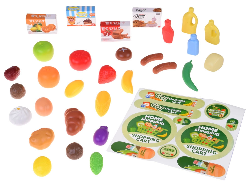 Súčasťou sú ovocie, zelenina, pečivo, nápoje, krabičky aj samolepky. Deti si tak užijú realistické nakupovanie a triedenie potravín.
