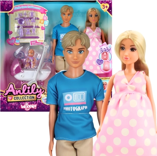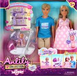 - Mamička v tehotenstve s vyberateľným bábätkom, otecko, bábätko, kočík, doplnky (fľaša, miska, cumlík, plienky, hrebeň, tanierik)