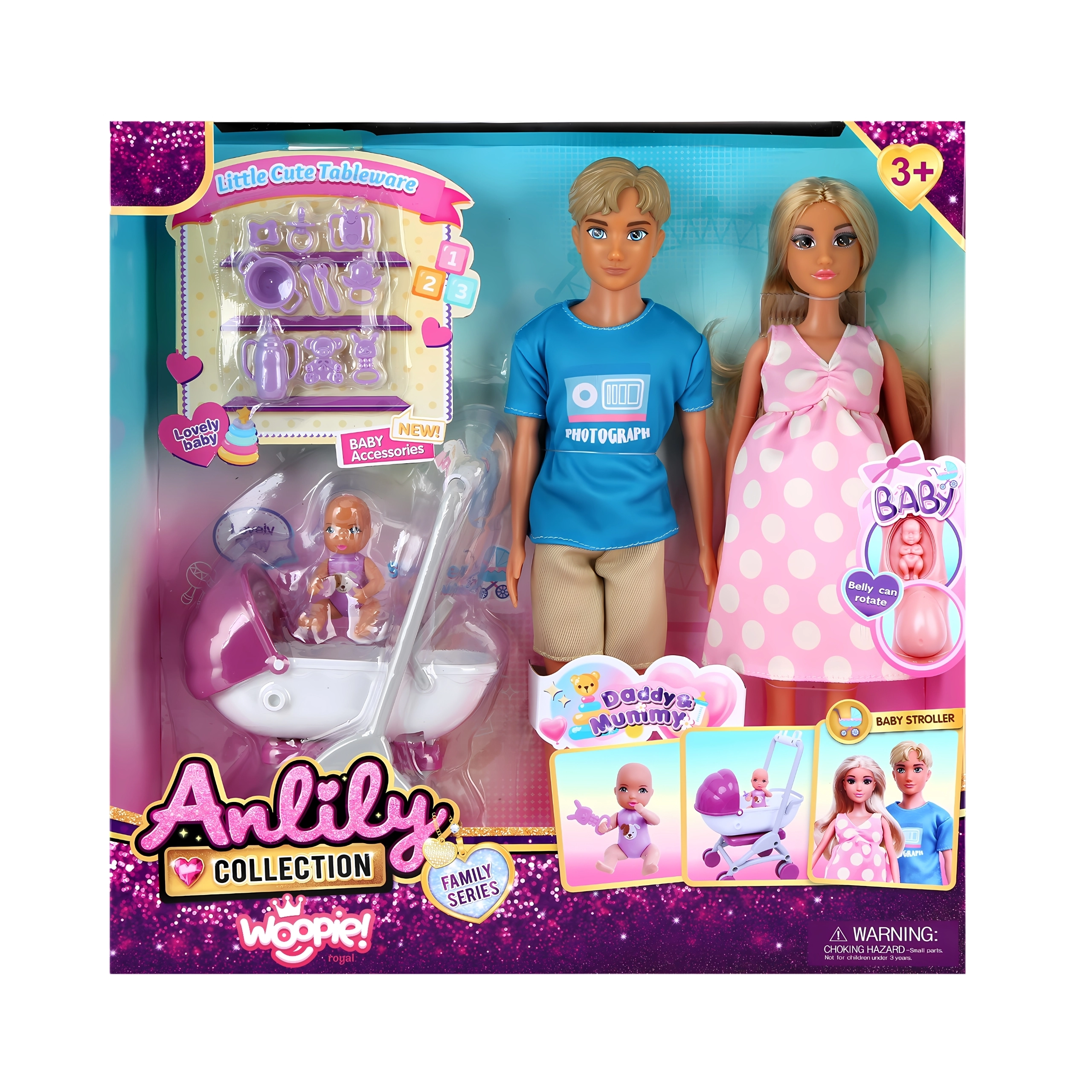 Objavte čaro rodinných príbehov s detailne spracovaným setom bábik WOOPIE. Deti si môžu prehrávať každodenné situácie – od starostlivosti o bábätko až po rodinné prechádzky s kočíkom. Mamička má vyberateľné bábätko v brušku, otecko je oblečený v modernej košeli a bábätko možno pohodlne voziť vo funkčnom kočíku. Súčasťou sú aj praktické doplnky na kŕmenie a starostlivosť, ktoré zvyšujú realistickosť hry.