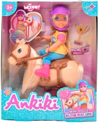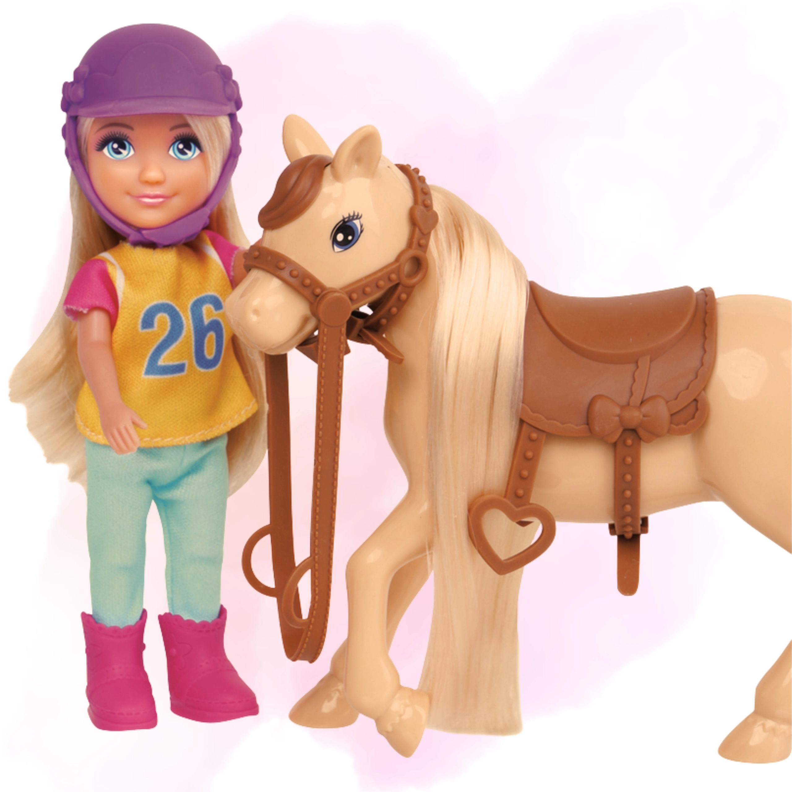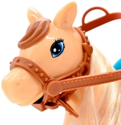 - bábika jazdkyňa, ochranná helma, figúrka koňa so svetlou hrivou a chvostom, sedlo a uzdička