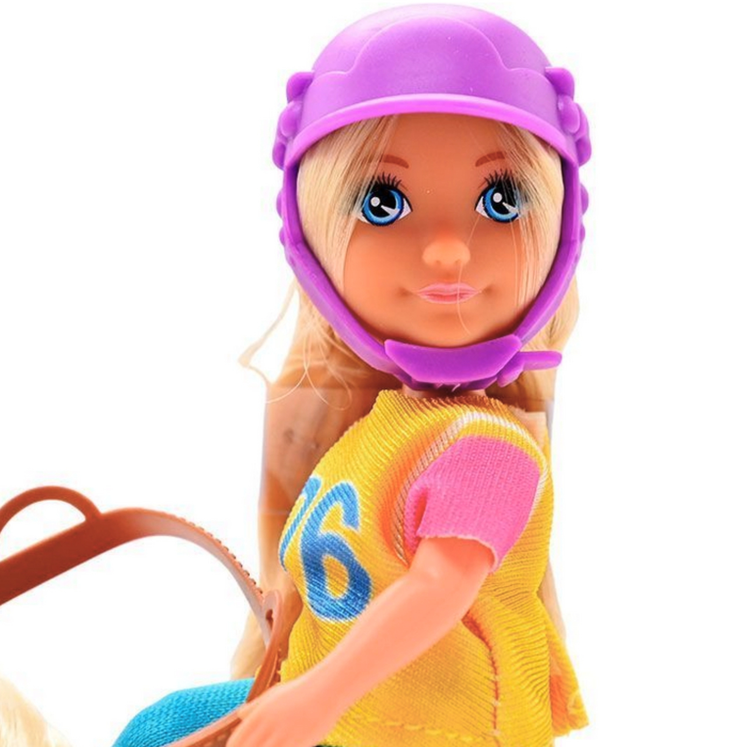 - Štýlový vzhľad – fialová helma, ružové a žlté detaily, svetlohnedý kôň