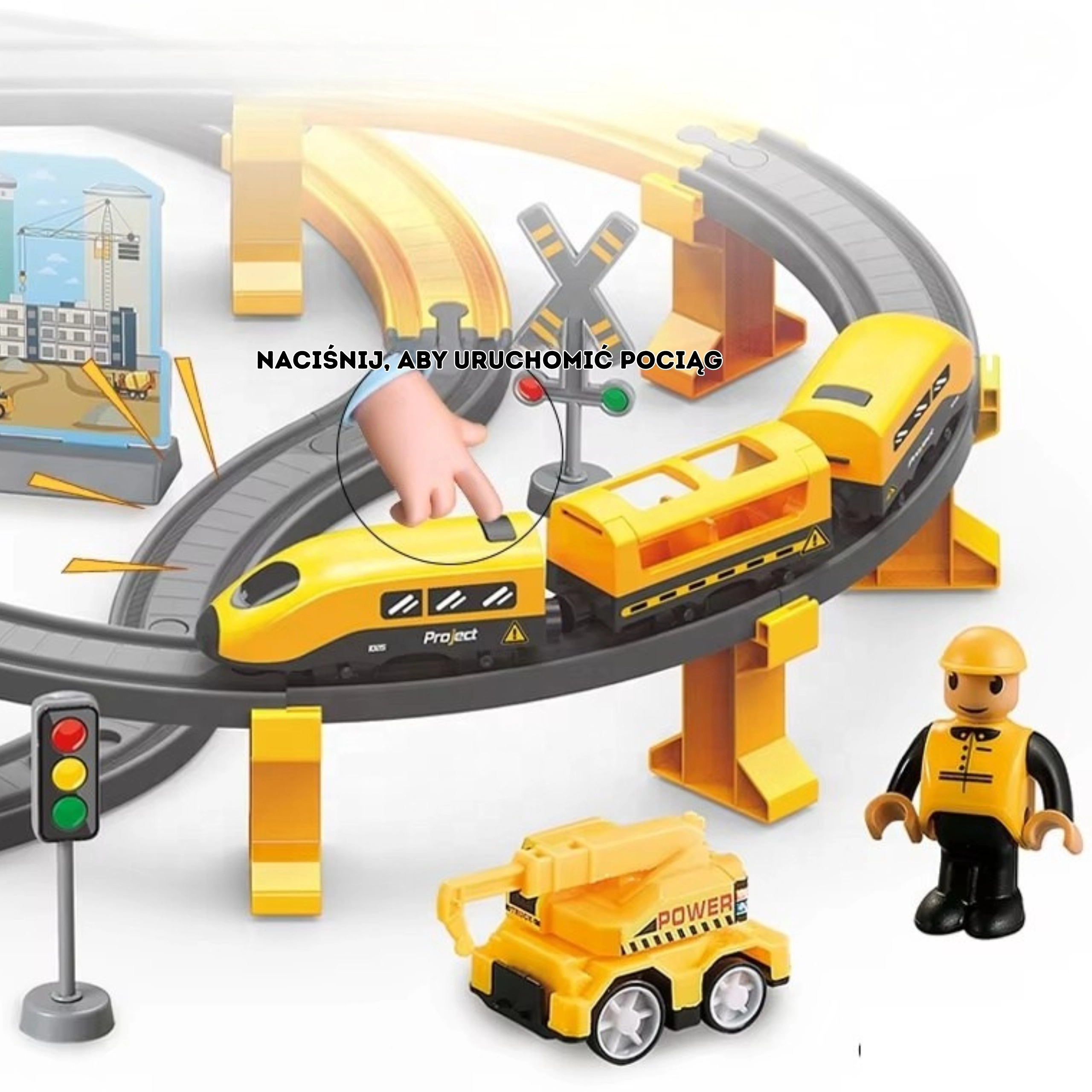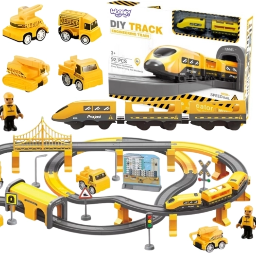 Objavte kreatívny svet železnice so setom WOOPIE, ktorý kombinuje napínavú jazdu vlaku so stavbou tratí a mestského prostredia. Žltý expres s elektrickým pohonom prechádza cez most a tunelom, míňa svetelné signály a dopravné značky – presne ako na skutočnej železnici. Jeden z dielov trate pri prejazde vlaku spúšťa autentické zvukové efekty, ktoré umocnia zážitok z hry.