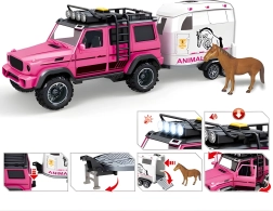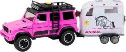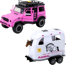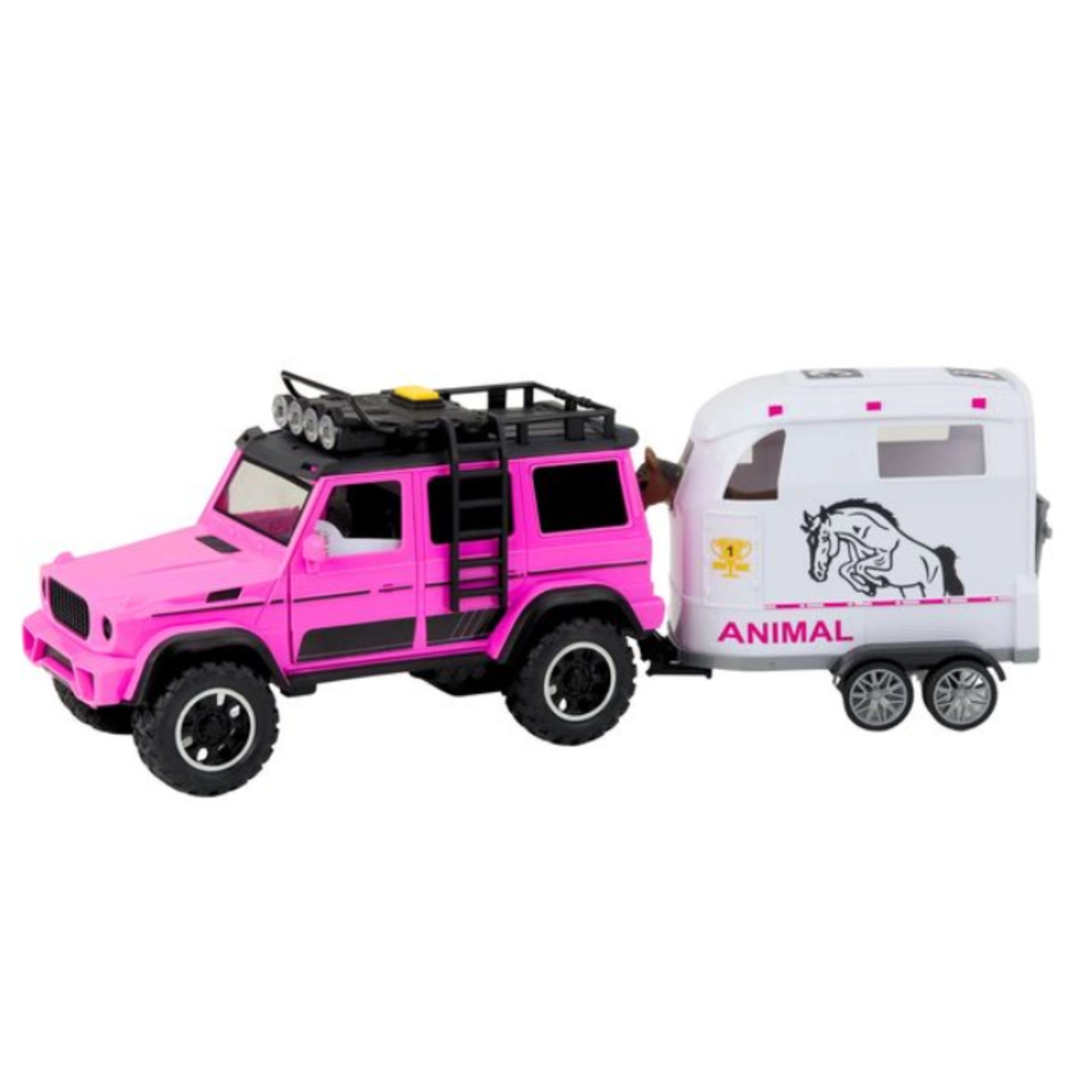 Tento detailne spracovaný set je ideálny pre malých milovníkov zvierat a terénnych vozidiel. Ružovo-biela kombinácia farieb zaujme na prvý pohľad a interaktívne prvky ako svetlá, zvuky a otváracie dvere prinášajú autentický zážitok z hry. Vďaka odnímateľnému prívesu sa deti môžu hrať s autom, prívesom aj koníkom samostatne a rozvíjať tak fantáziu.