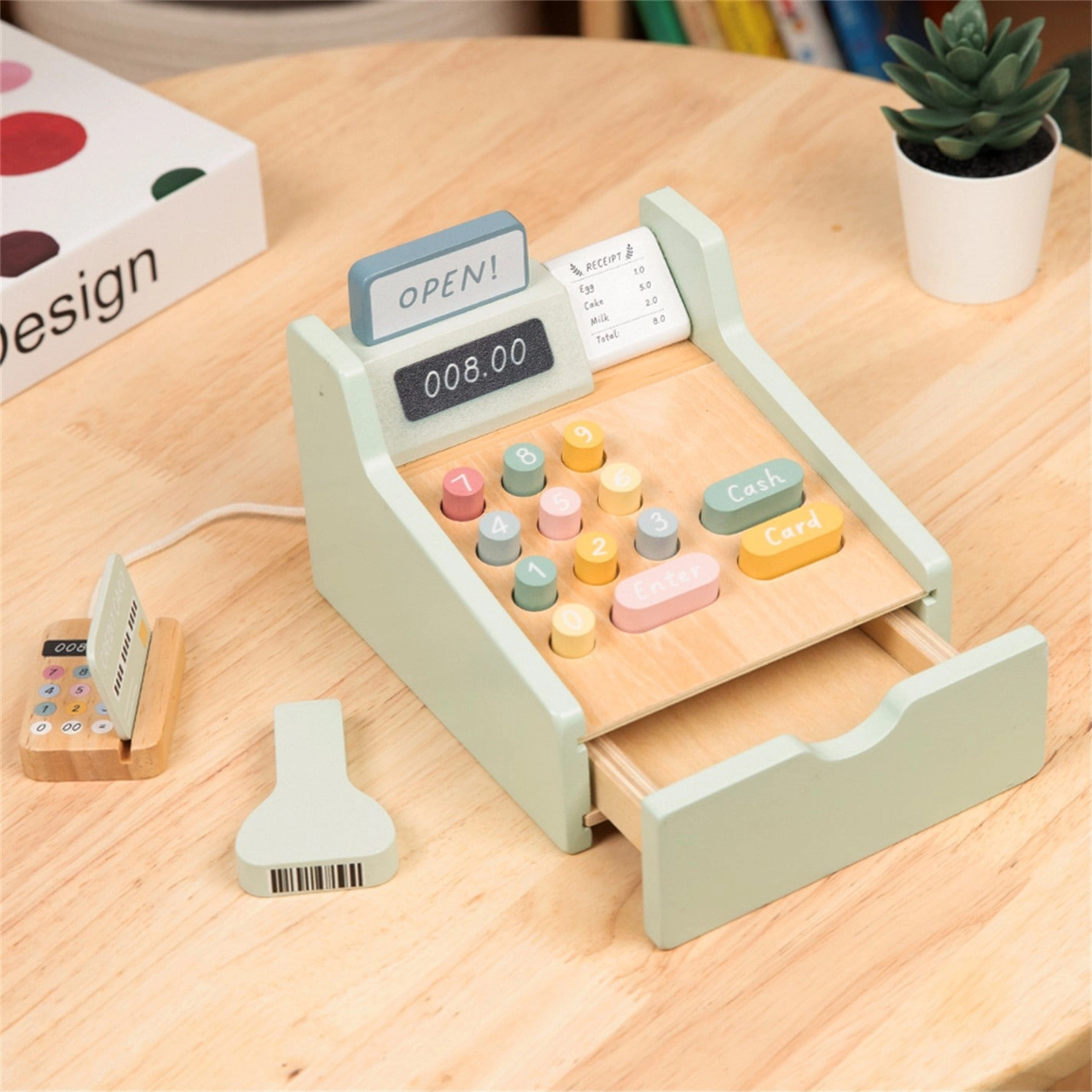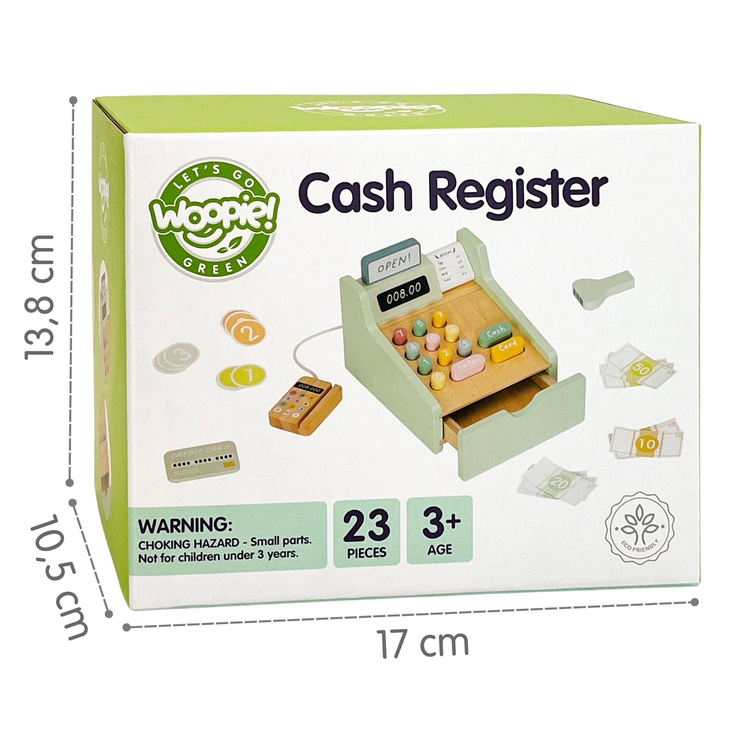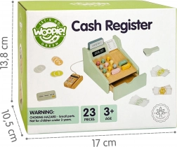 Drevená pokladňa WOOPIE GREEN je ideálna hračka pre deti od 3 rokov, ktoré milujú hru na obchod, kaviareň alebo reštauráciu. Vďaka funkčným prvkom, ako je výsuvný šuplík na peniaze, skener čiarových kódov a čítačka platobných kariet, sa deti naučia základy platenia a hospodárenia s peniazmi prirodzenou a zábavnou formou.